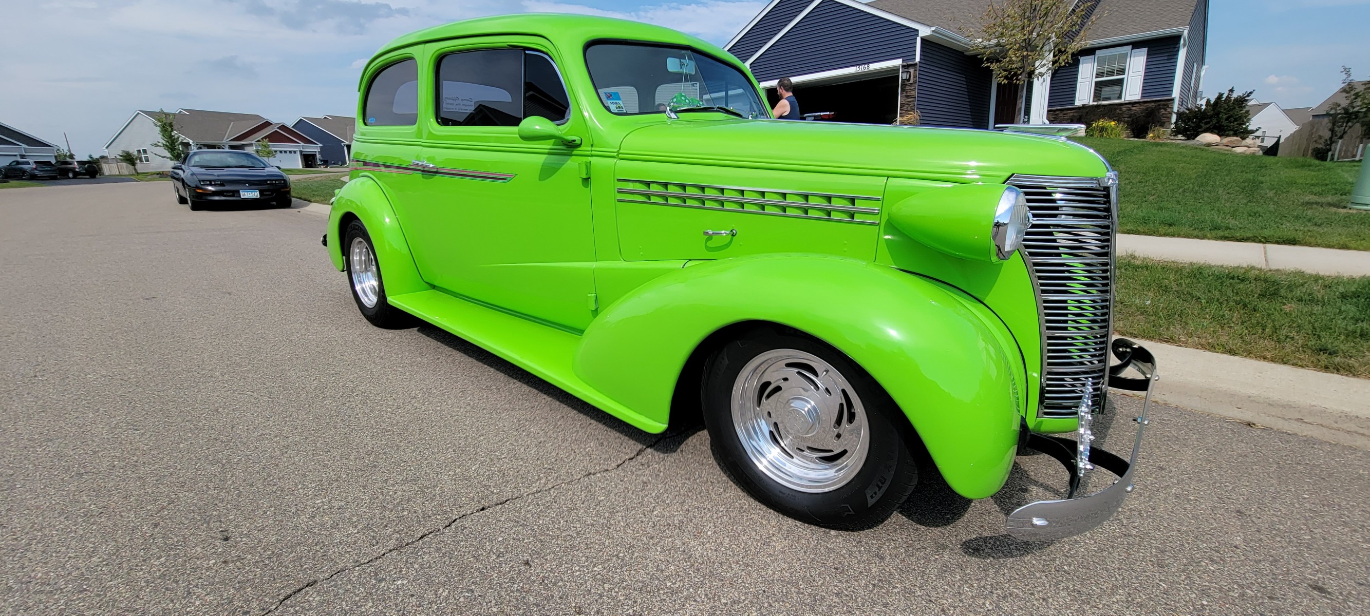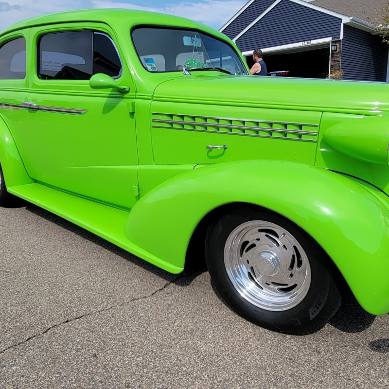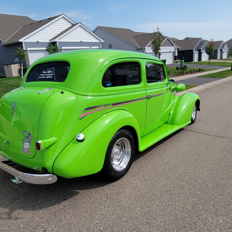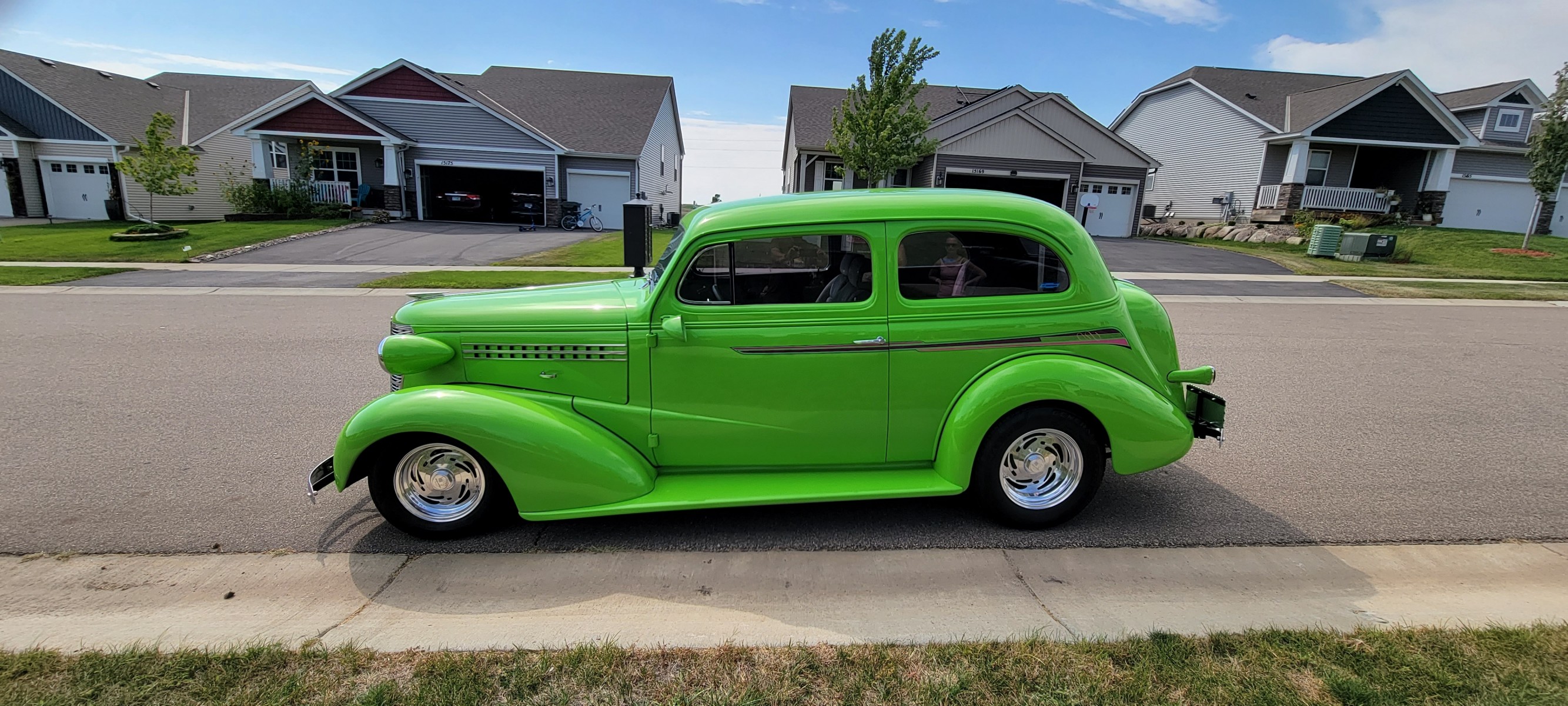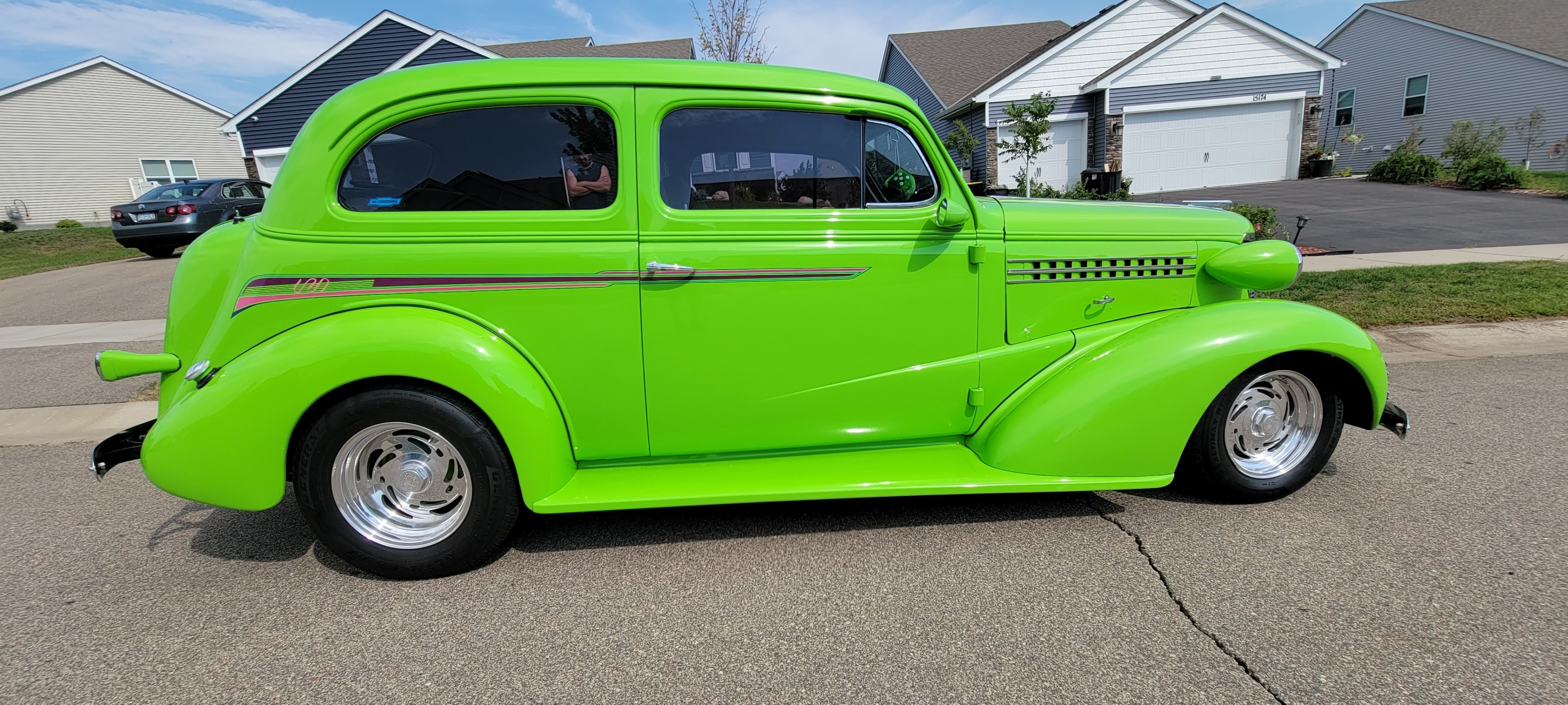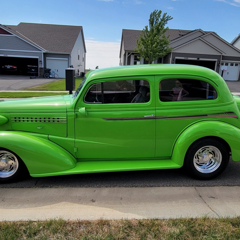 This high end built 1938 Chevrolet Mater Deluxe Street Rod just came in and has all the bells and whistles to get in and cruise anywhere! It has a built 350ci small block Chevy with a Weiend aluminum intake, Eldebrock carburetor, HEI ignition, full serpentine belt system, custom air filter, Th400 3 speed automatic, aluminum radiator with electric fan, power steering, Vintage A/C and Heat system which blows ice cold, power rack and pinion front clip with power front disc brakes. The custom interior is in great condition. It has front bucket seats, overhead console, billet door handles and window cranks, tilt steering column with an aftermarket steering wheel, custom air vents, full Classic Instruments dash gauges which are all in good working condition. The headliner, sun visors dash board, kick panels, etc are in great condition. The trunk is fully boxed and upholstered and in good condition. The vehicles battery is located in the trunk area. The Billet Specialties wheels are in great condition, tires are in good condition, chrome bumpers are also in good condition. There is a working aftermarket cd player located in the center console. This is a beautiful and well built street rod that is turn key and needs nothing but a new home. Some maintenance receipts come with the sale. We have additional photos and video available.