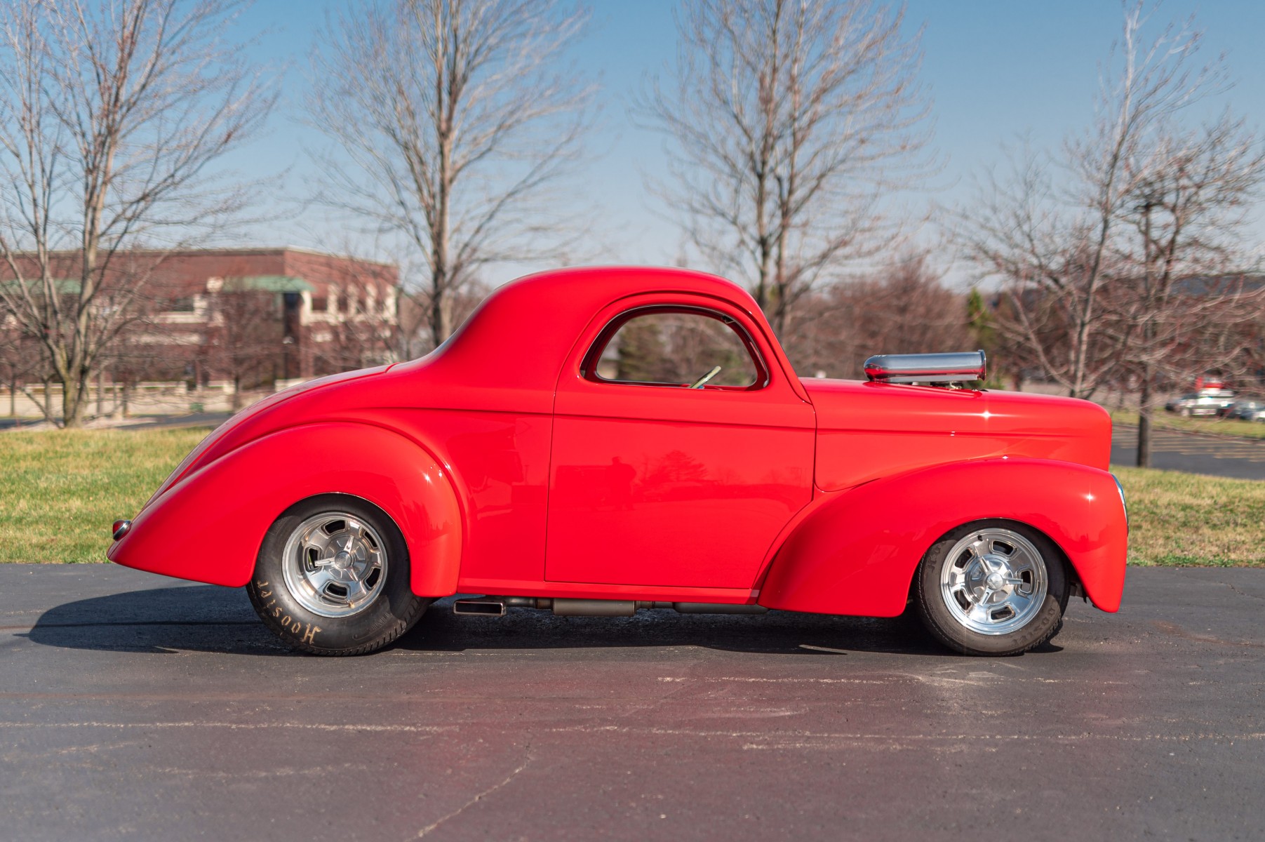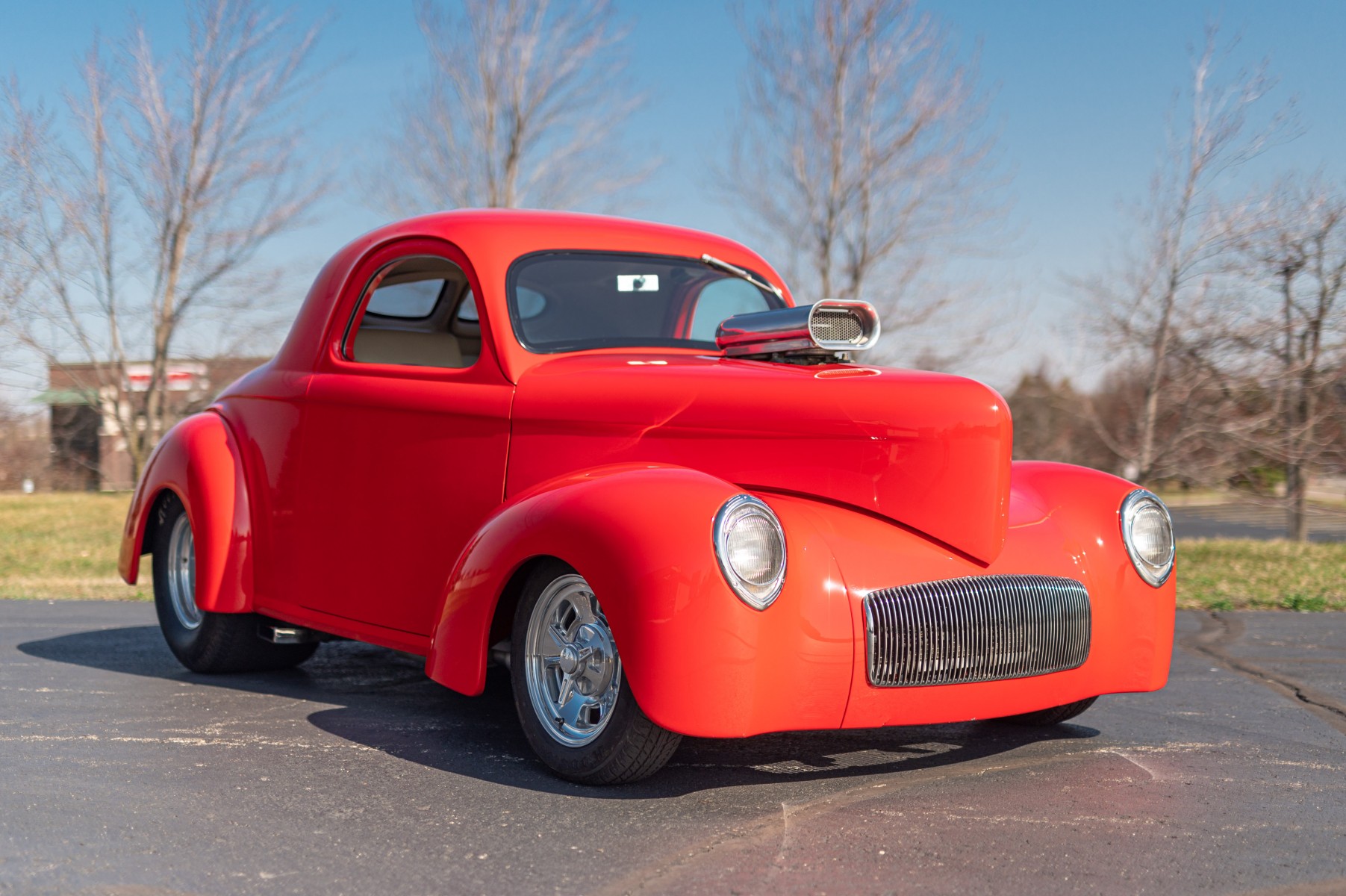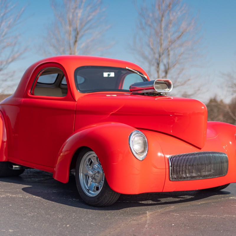 1941 Willys Americarn Pro-Street coupe. This special hot rod was built with an Outlaw Stage III tubular, powder coated chassis and 5-link rear coil over suspension. The body is fiberglass and was also manufactured by Outlaw. The finish is beautiful and is painted Viper Red. The interior is tan and ivory and covered in a pleather material. The pleather material that was used in creating the interior has been disintegrating and need to be replaced. As such, we stitched and installed a custom set of fitted seat covers that go over the seats. These are nice looking and very well made. The car is further equipped with Billet Specialties wheels 15x6 fronts and 15x16 rears with Pro-Street Hoosier tires. The GM 468cid engine is equipped with a B&M 671 blower, roller cam and valve train and a steel crank. The car was built by the recognized pro builder Terry Pennington.