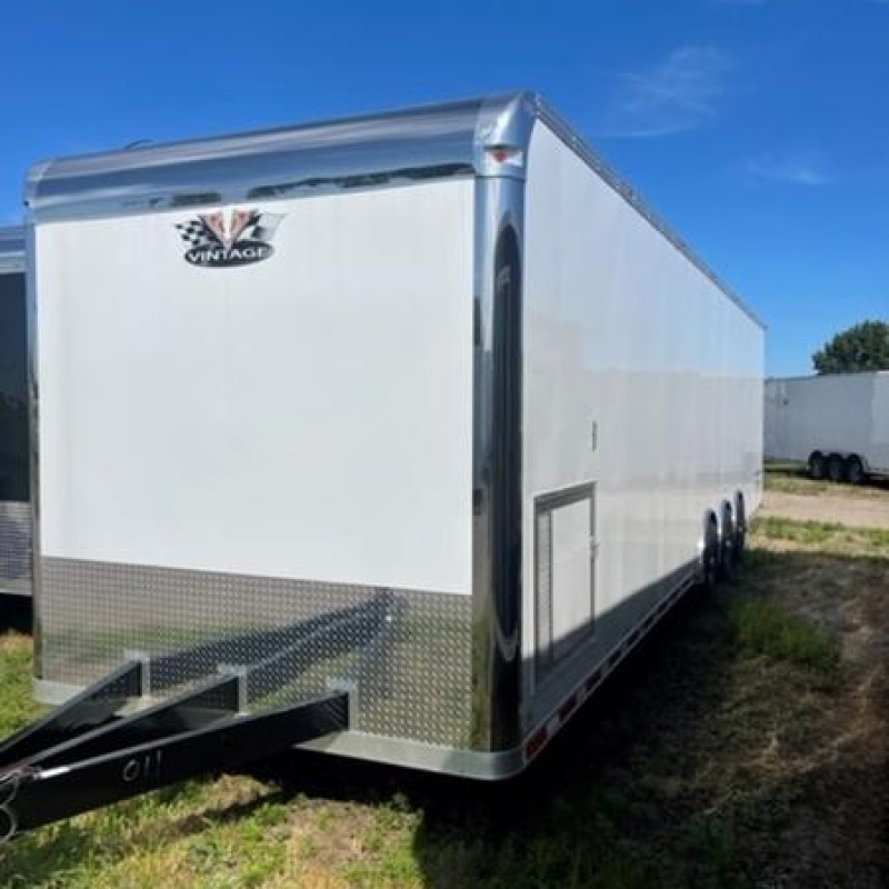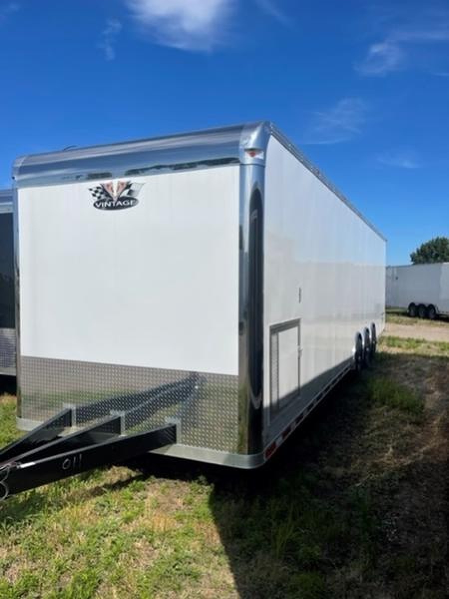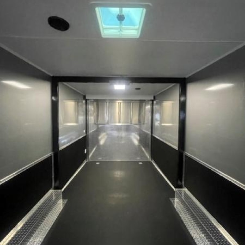 frame, 7'6" interior height, silver aluminum walls, white vinyl ceiling, rear ramp door, 48" double side door, drop axles,
