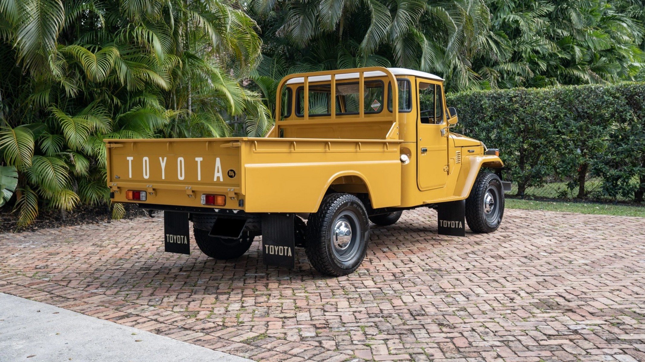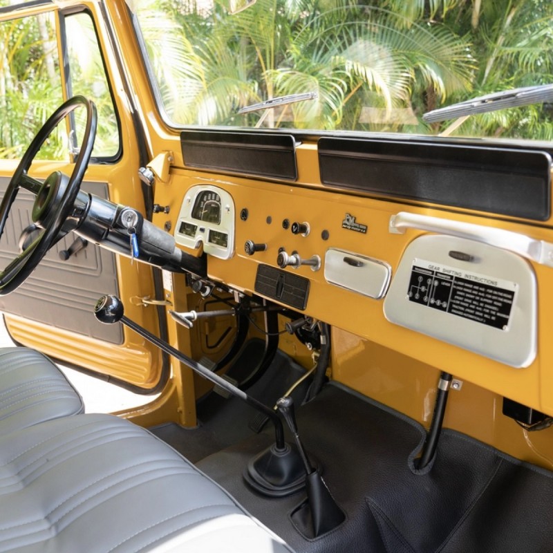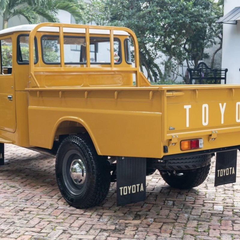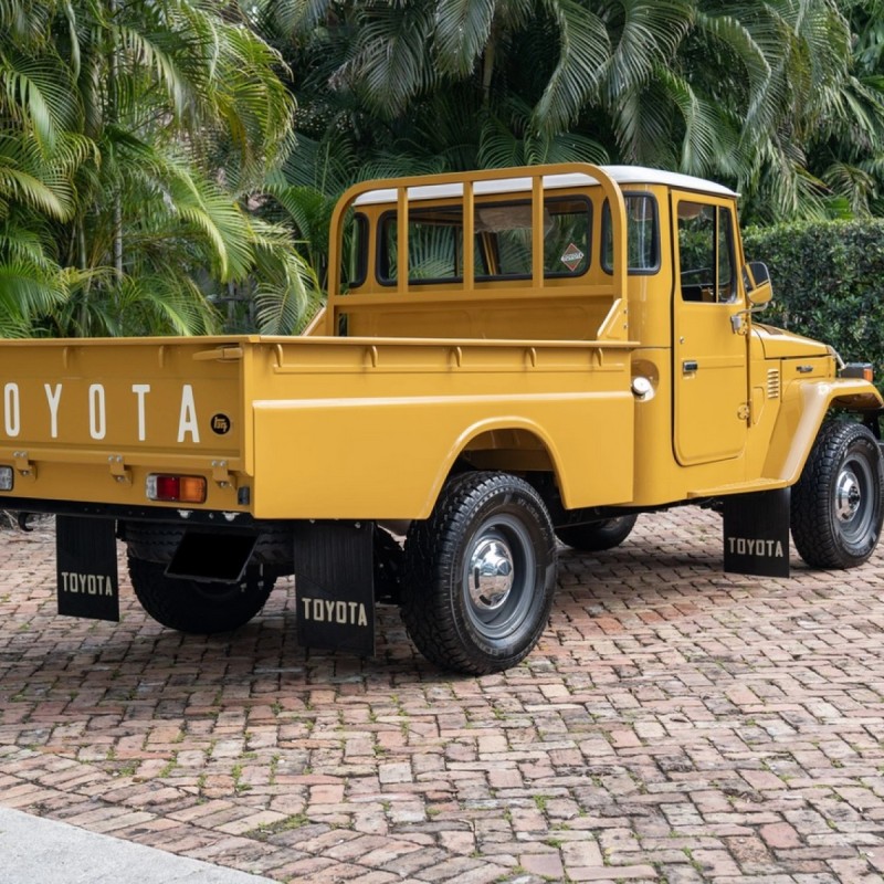 This 1976 Toyota Land Cruiser HJ45 is finished in yellow with a white roof and powered by a 3.6-liter H diesel inline-six paired with a four-speed manual transmission and a dual-range transfer case. Additional equipment includes a fold-down windshield, a headache rack, and gray-painted steel wheels.