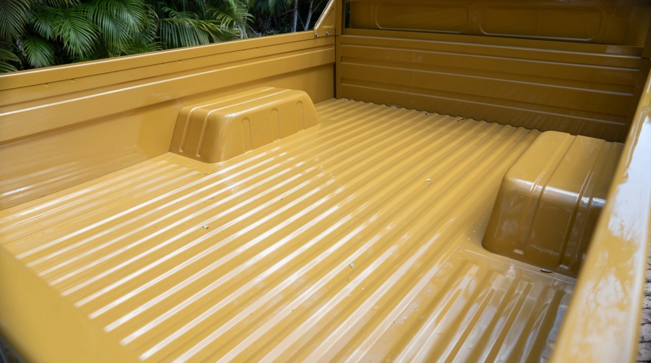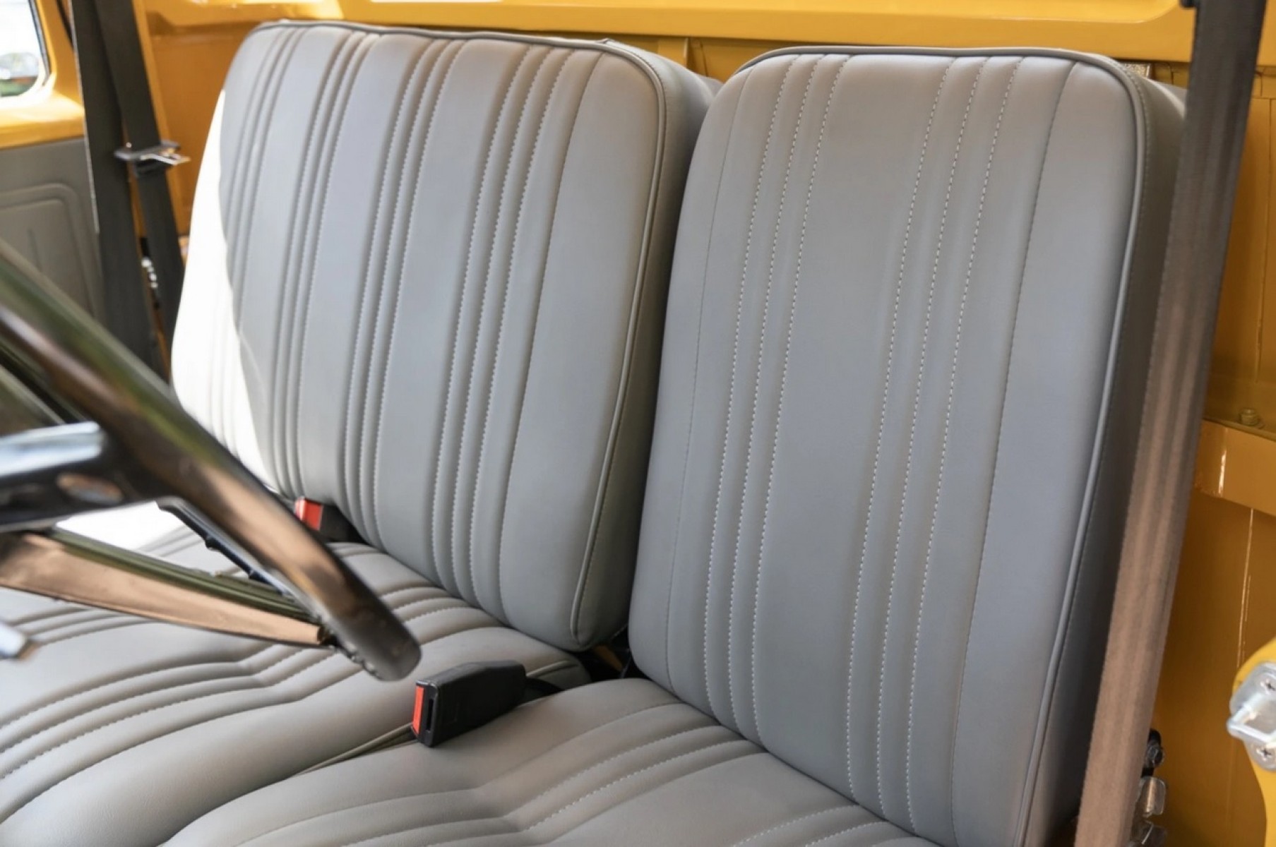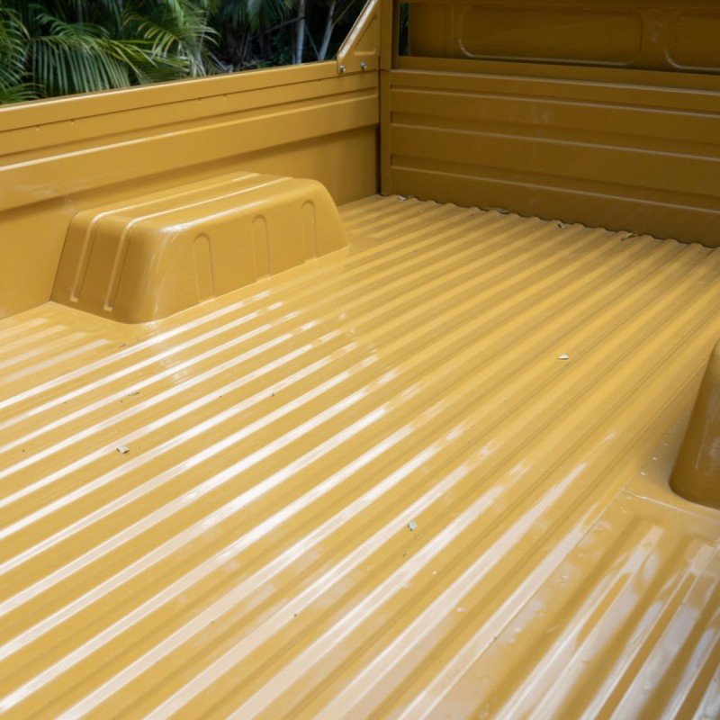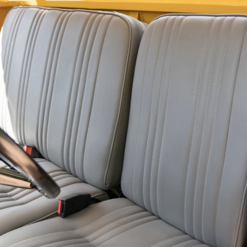 This 1976 Toyota Land Cruiser HJ45 is finished in yellow with a white roof and powered by a 3.6-liter H diesel inline-six paired with a four-speed manual transmission and a dual-range transfer case. Additional equipment includes a fold-down windshield, a headache rack, and gray-painted steel wheels.
