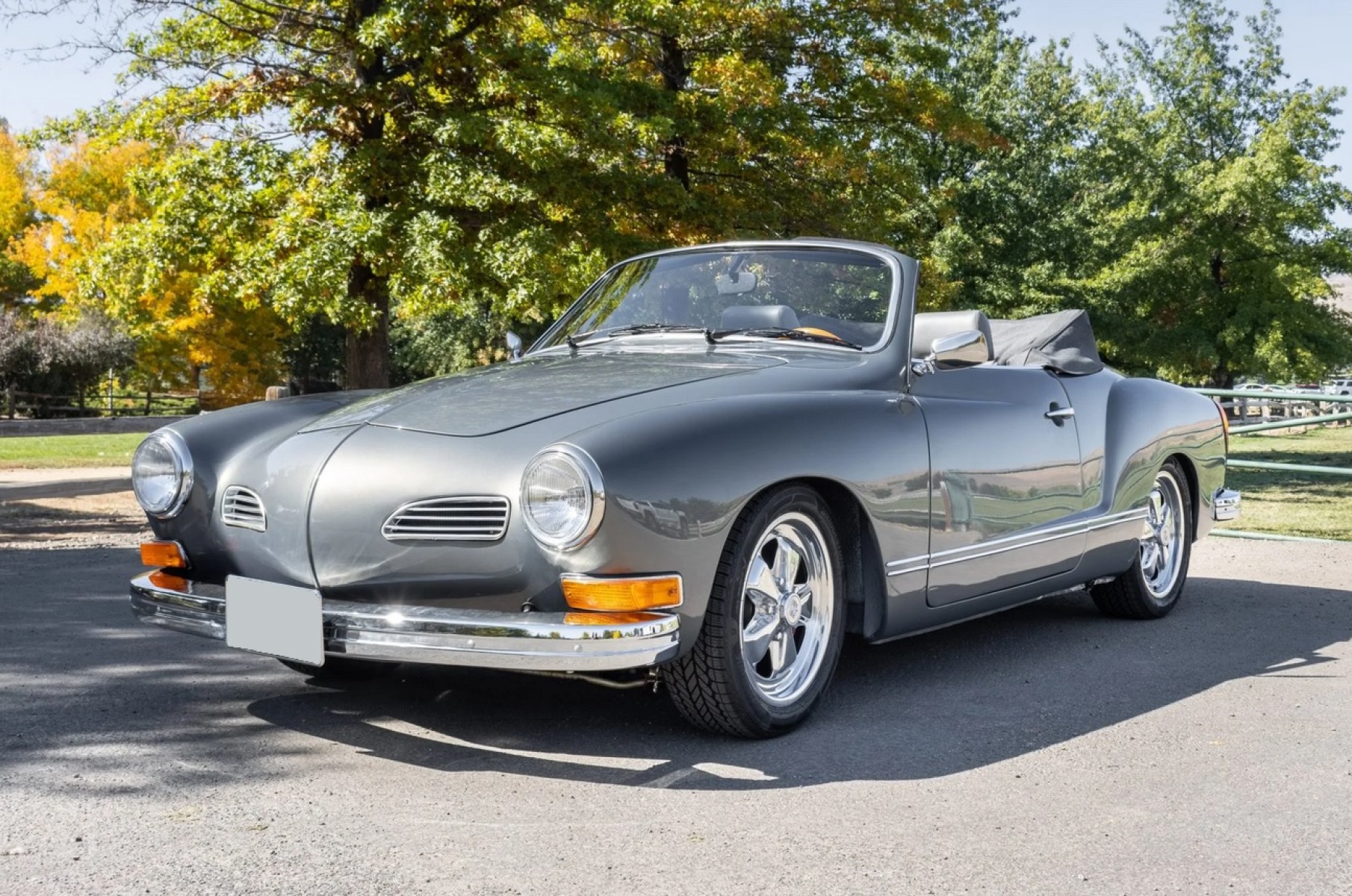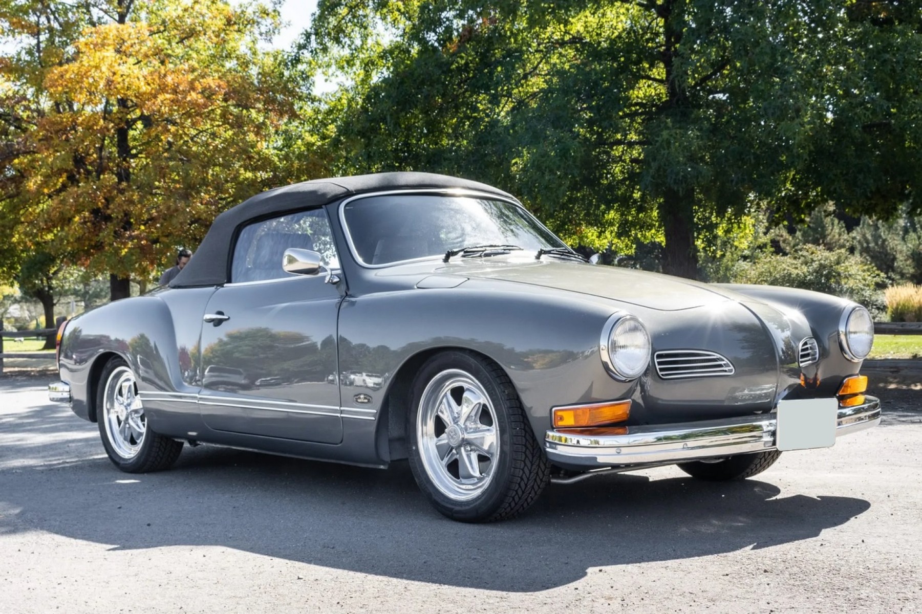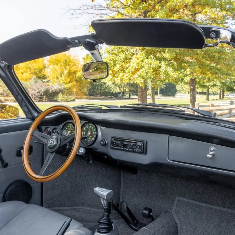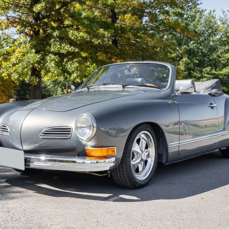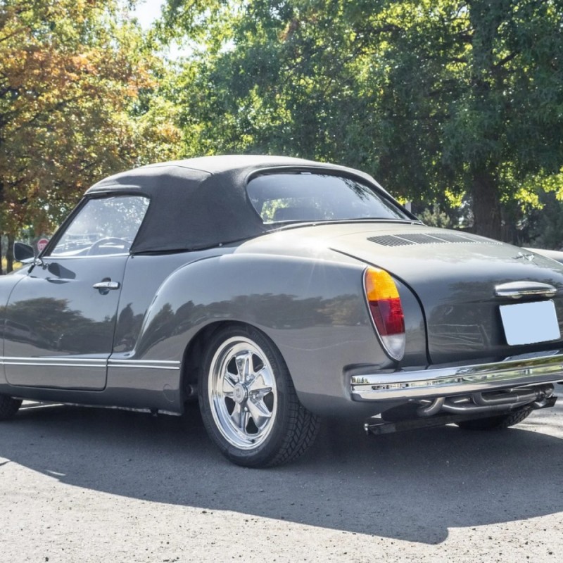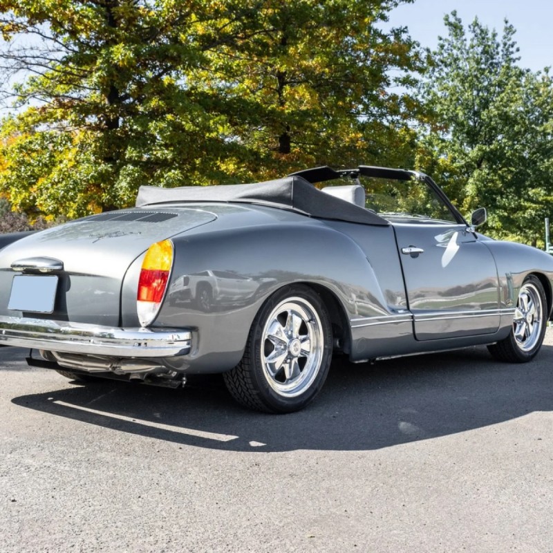 This 1973 Volkswagen Karmann Ghia convertible is powered by a replacement 2,006cc flat-four linked to a Berg 5-converted five-speed manual transaxle and a limited-slip differential and is refinished in gray over gray vinyl. Equipment includes 16” Fuchs-style wheels, a replacement convertible top, an A1 Sidewinder exhaust system, KYB shocks, Sway-A-Way suspension components, four-wheel disc brakes, SCAT Elite bucket seats, replacement VDO instrumentation, a folding rear bench, and a Kenwood head unit linked to a Clarion amplifier and Infinity speakers.