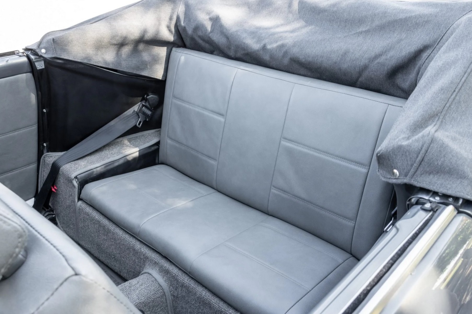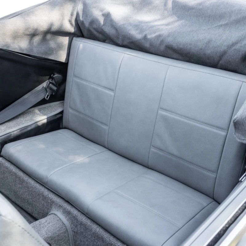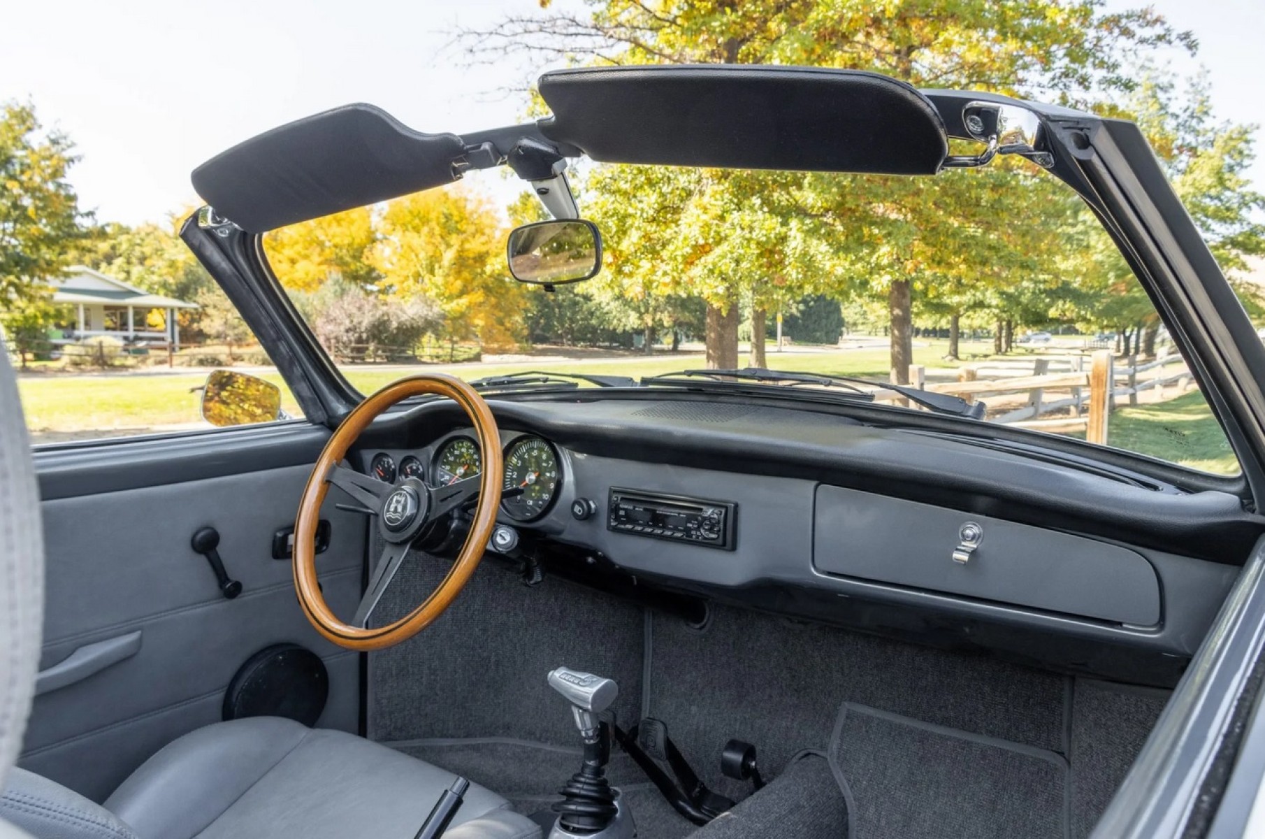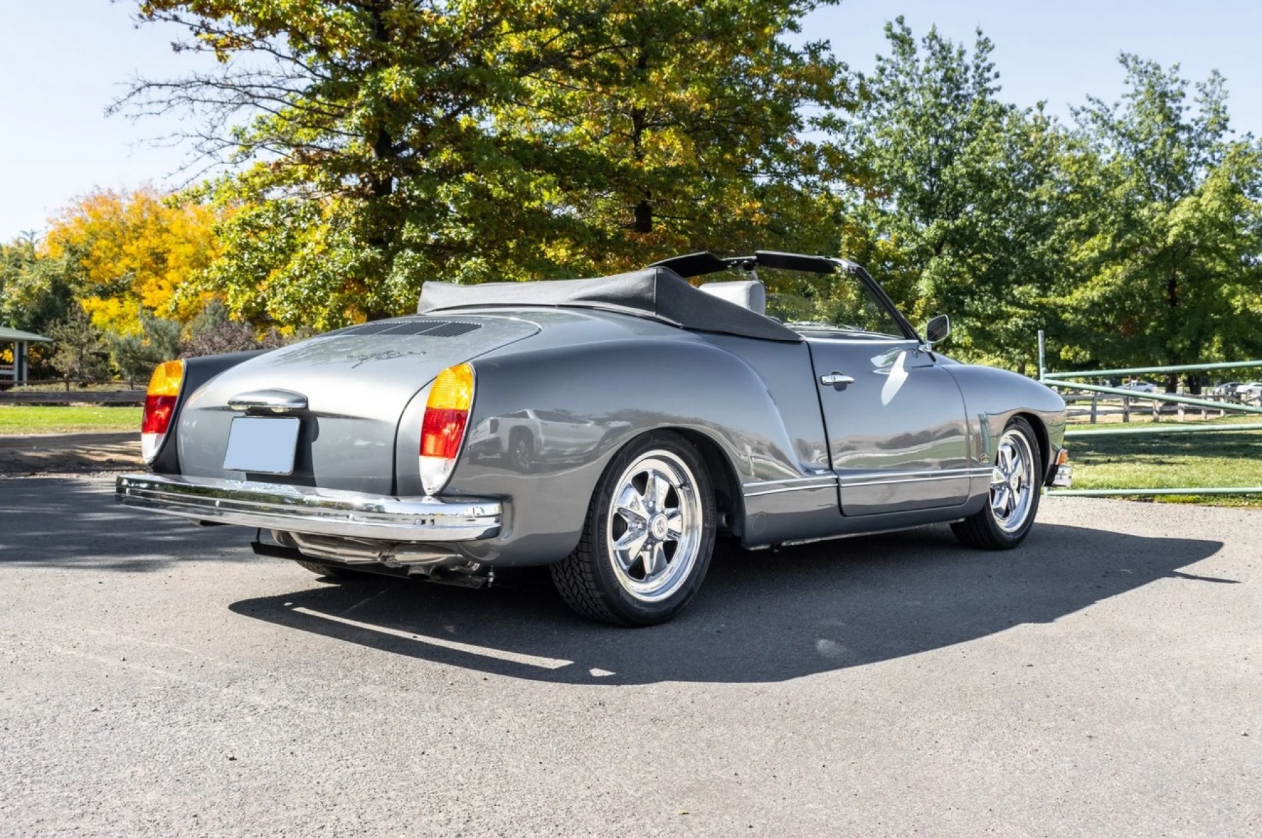 This 1973 Volkswagen Karmann Ghia convertible is powered by a replacement 2,006cc flat-four linked to a Berg 5-converted five-speed manual transaxle and a limited-slip differential and is refinished in gray over gray vinyl. Equipment includes 16” Fuchs-style wheels, a replacement convertible top, an A1 Sidewinder exhaust system, KYB shocks, Sway-A-Way suspension components, four-wheel disc brakes, SCAT Elite bucket seats, replacement VDO instrumentation, a folding rear bench, and a Kenwood head unit linked to a Clarion amplifier and Infinity speakers.