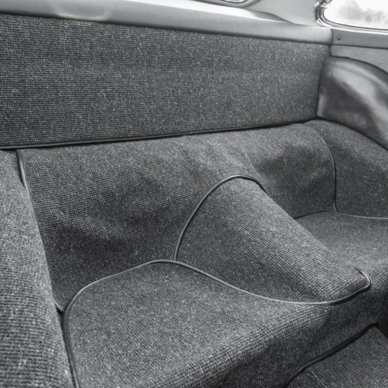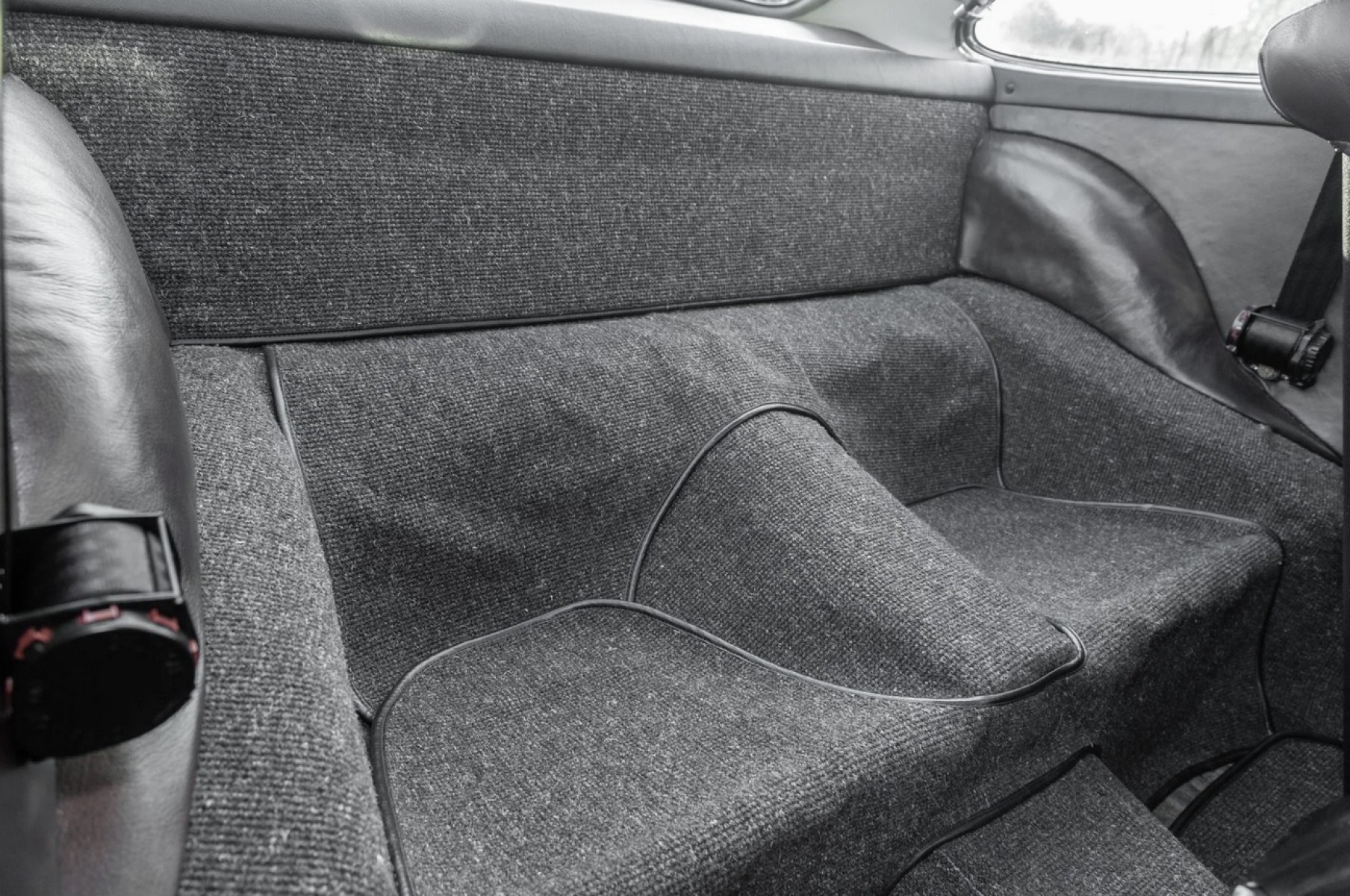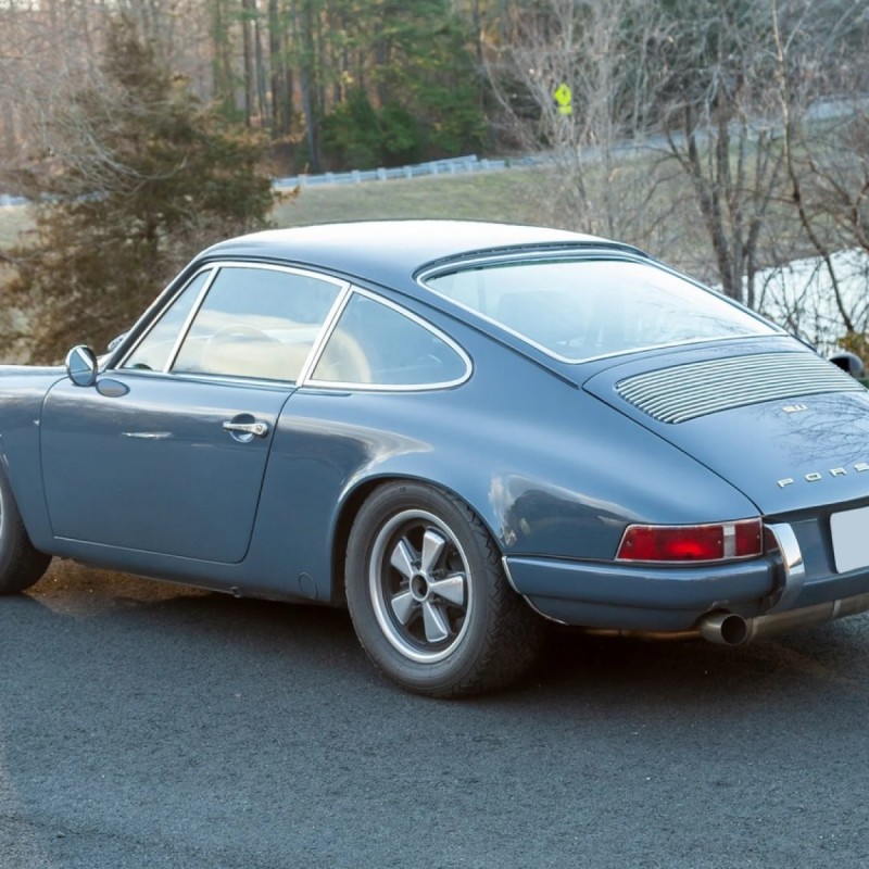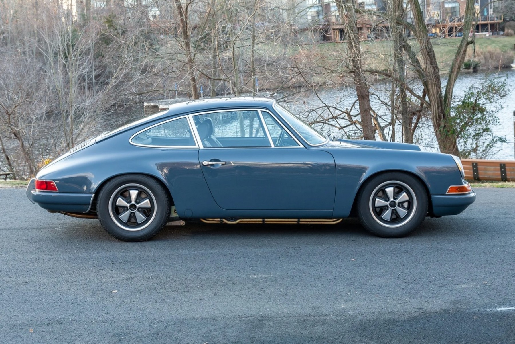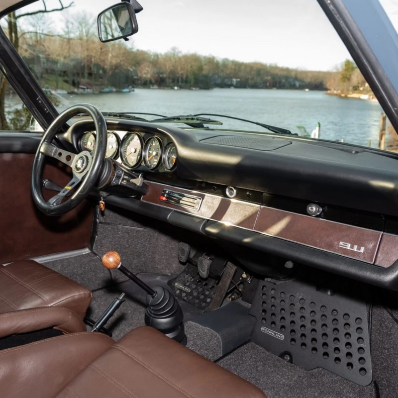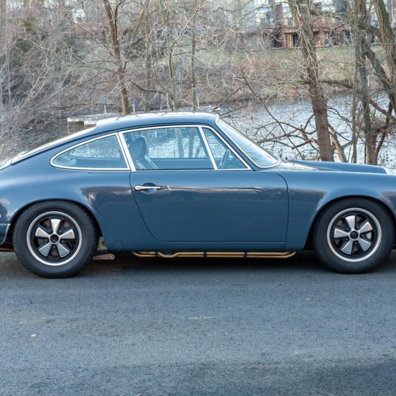 This 1971 Porsche 911T was stripped and refinished in blue over brown leather, and a fuel-injected 3.2L flat-six was sourced from a 1980s Carrera. Power is delivered to the rear wheels through a five-speed 915 manual transaxle, and other features include 15" Fuchs wheels, disc brakes, modified suspension, Recaro Rallye seats, Rennline floorboards, custom door panels, and a Momo steering wheel.
