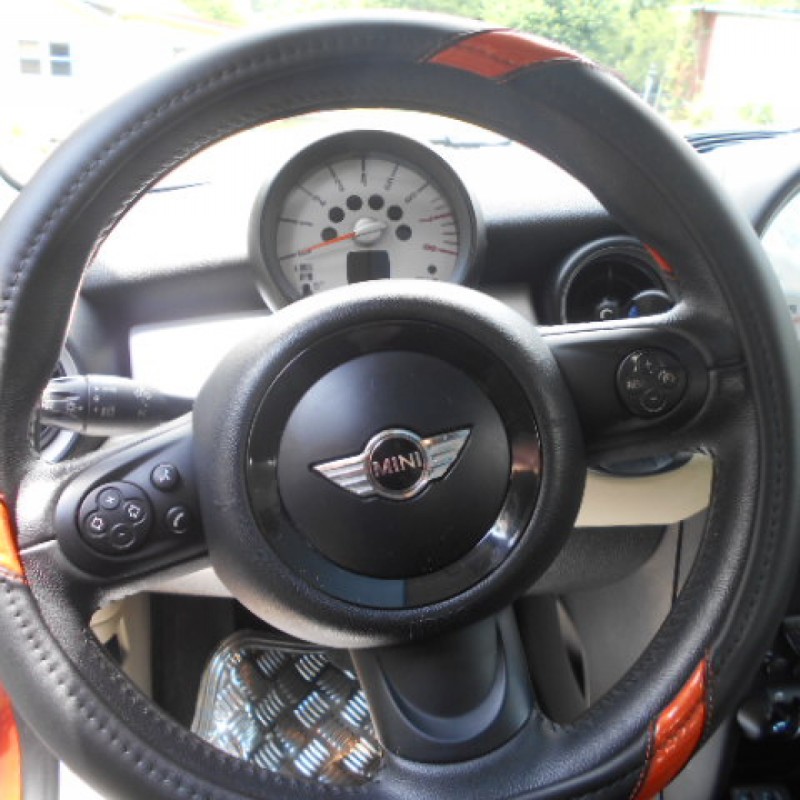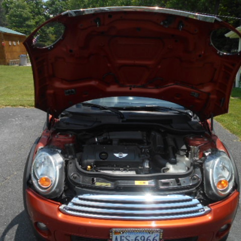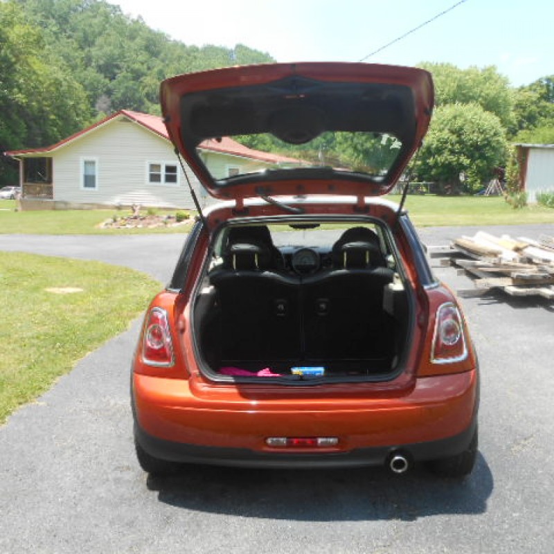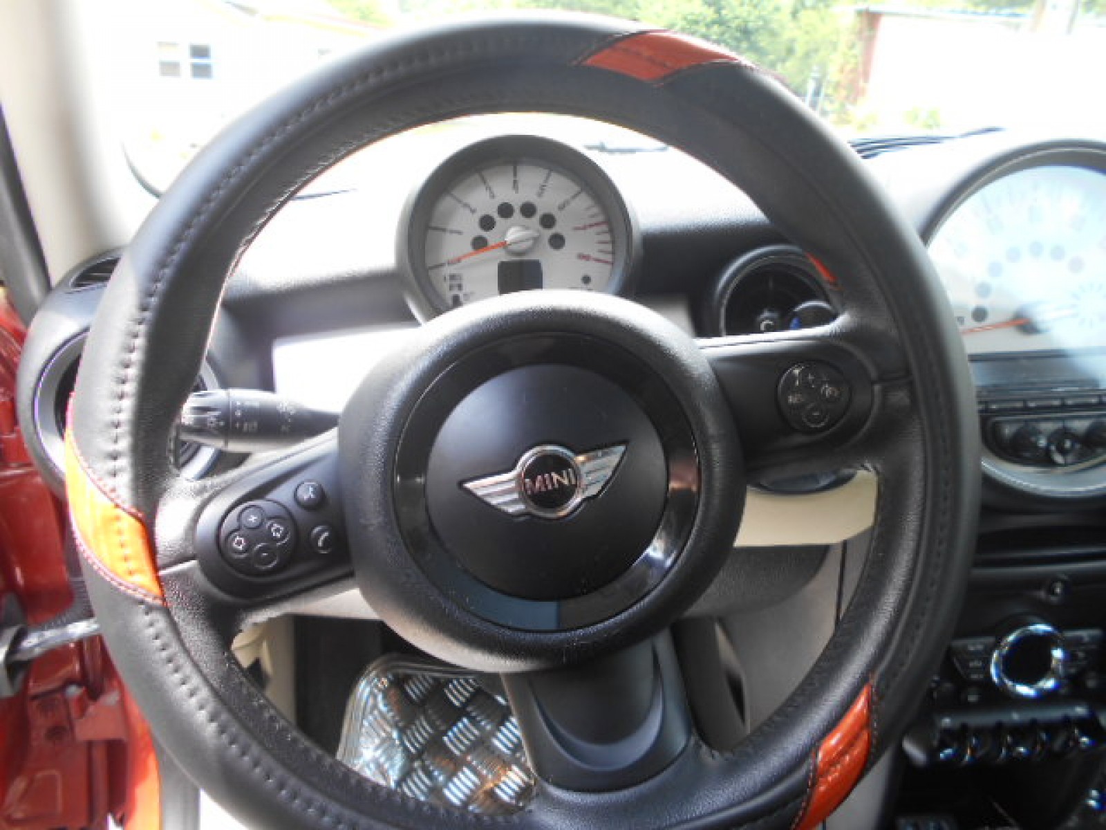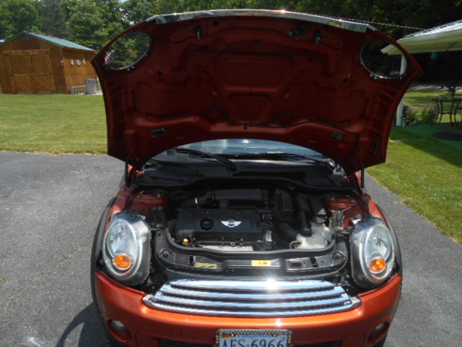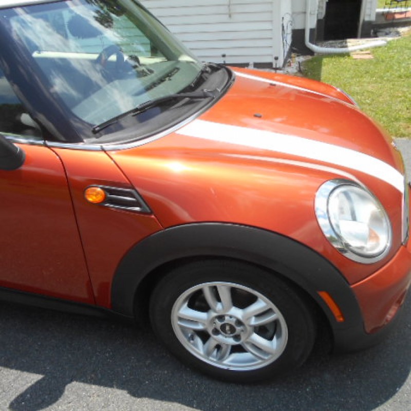 2013 Mini cooper with all options. That a base cooper has. Been serviced well. New tires. second owner, Has 145,000 miles on it. has double sun roof. Minor wear, No holes rips or tears anywhere in the car. Great inside. Out side paint is good and shiny. Has different color changing lighting on the inside. Has Sirus Xm radio 6 speakers, Great sound. The color is a rear Fiesta Orange with a white top and white adjustible mirrors. And wide white racing stripes on the hood. Sports mode or regular transmission. Leather seats great interior. Seats lay down to haul larger things. Has a good cargo place for many items. Has spare tire and changing tools.