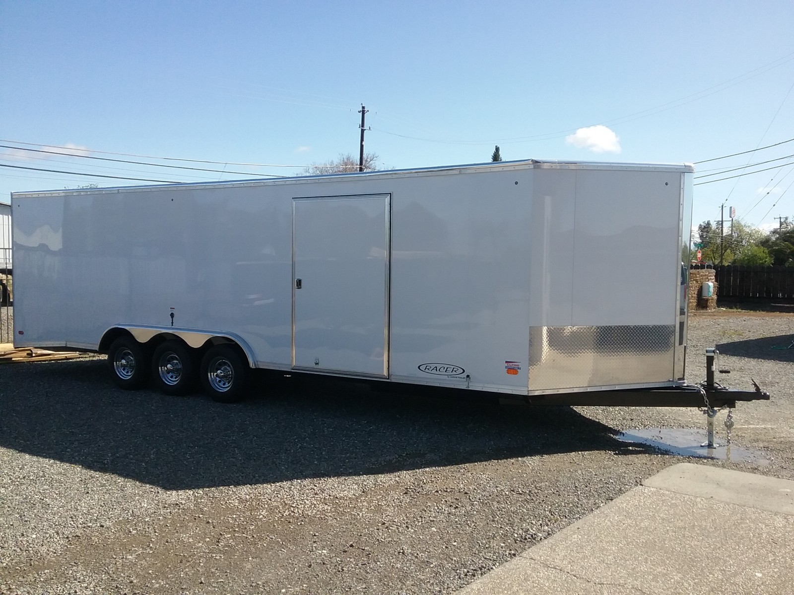 2020 Custom 28’ Carson Deluxe V-Nose Racer - NO UGLY SCREWS IN THE SIDING - with the following features: FULL LENGTH AWNING - All square and rectangular tubing construction, main frame and box – Smooth exterior, Composite Siding Look without the expense or added weight – Deluxe all white interior, walls and ceiling - Stone guard to protect the front – 4’ Wide double locking keyed RV style side door – Rear Ramp Door – True dovetail to help low cars entry – Four (4) Recessed “D” Ring tie downs – Torsion Axles – Brakes on all Axles – 225/75R15 Radial Tires on custom Chrome Wheels – Two Roof Vents – Two double interior lights. OPTIONS ON THIS TRAILER: 3rd 5200 lb. Torsion Axle with brakes – Gap Cover between the ramp door and the main floor - LED Exterior Running lights - V-Nose, adds extra space and helps break the wind – Full length Awning, for welcome shade on hot days at the track or car shows – Four (4) exterior LED bright lights under the awning – Rear ramp door LED Loading light – Triple Teardrop Fenders – Side door step – Protective covers over the roof vents, protects the roof vents from the sun and allows them to be open during travel – 46’ of E-Track tie down track in the floor (23’ each side) – Winch plate under the floor - 5,000 lb. winch with remote – 12 volt RV battery to run the winch and the interior lights without being hooked to the tow rig. Our regular website price with the options listed (see our website) $16,700.00 – Performance Specialty Mega Special on this unit only $13, 895.00 + Sales tax.