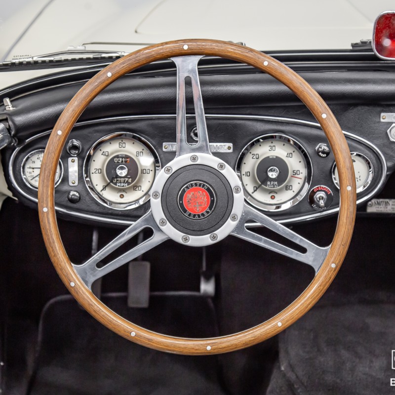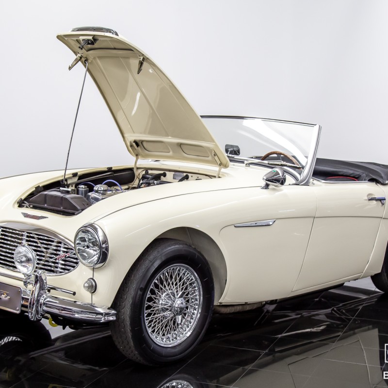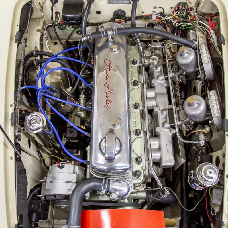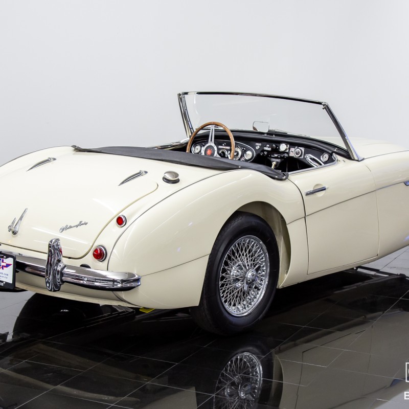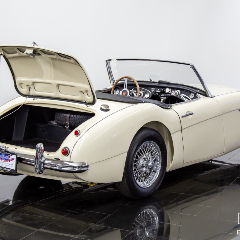 This garage kept, and virtually rust-free vehicle was completely stripped and placed on a rotisserie to bring it back to its original condition and factory appointed color. Even minor areas of concern were professionally treated and repaired before hours of body and undercarriage preparation. It would then be expertly painted with DeBeer automotive paint and entirely clear-coated for optimum protection and years of high gloss shine! The original engine was fully rebuilt and internally balanced with all new internals. This Austin Healey has traveled just 3,874 miles since completion and had been thoroughly vetted in all weather conditions. Included with the sale with be a copy of the British Motor Industry Heritage Trust Certificate showing that the car remains presented in the original color combination while continuing to retain all original drivetrain components (original transmission & overdrive unit included) and factory body tags. A book highlighting some of the restoration photos is also included with the sale. Every vintage automobile enthusiast hopes to buy a car from this kind of previous ownership care and preservation.