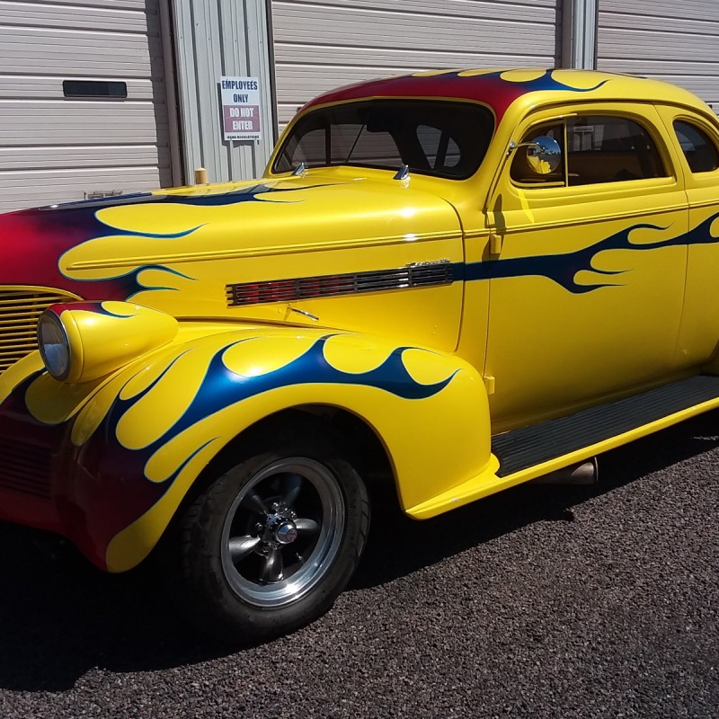 Boxed And Modified frame, tubed wheel wells , lightly modified Chevrolet 454 CID and Modified Turbo 400 auto transmission with shift kit, posi Ford 9″ rear end with 3:70 gears, Moser Engineering 31 spline forged steel axles and has typical rear end whine. 3″ stainless steel exhaust with lake side caps, over sized Mickey Thompson Radial cheater slicks, full roll cage with racing harness safety belts, mechanical belt driven fan and switch controlled electric front fan, all steel body, sight chopped roof including side vent wing windows, multi metallic yellow paint with flames under clear coat ( even flames under hood ), shaved door and trunk handles and power door poppers. The nostalgic alloy wheels compliment the vintage hot rod appearance. The car is fully operational and street worthy. This is definitely a high quality build with great attention to detail. . . .