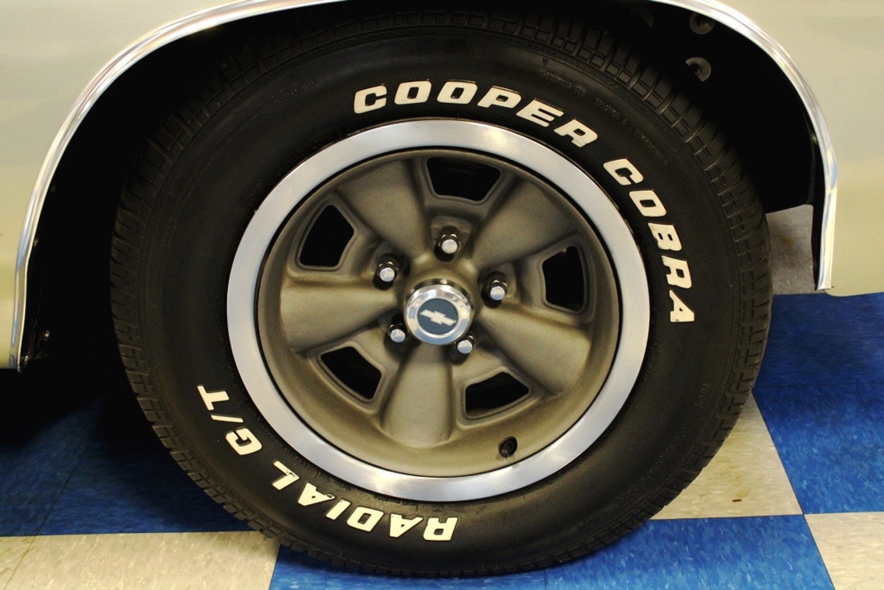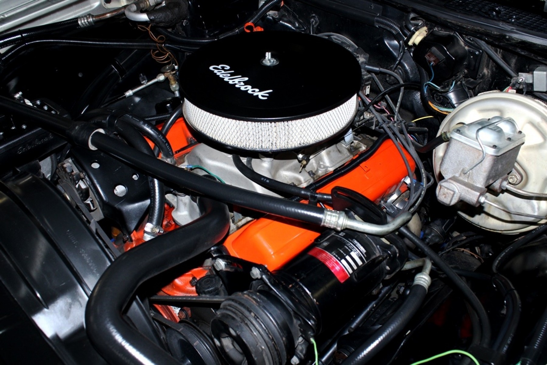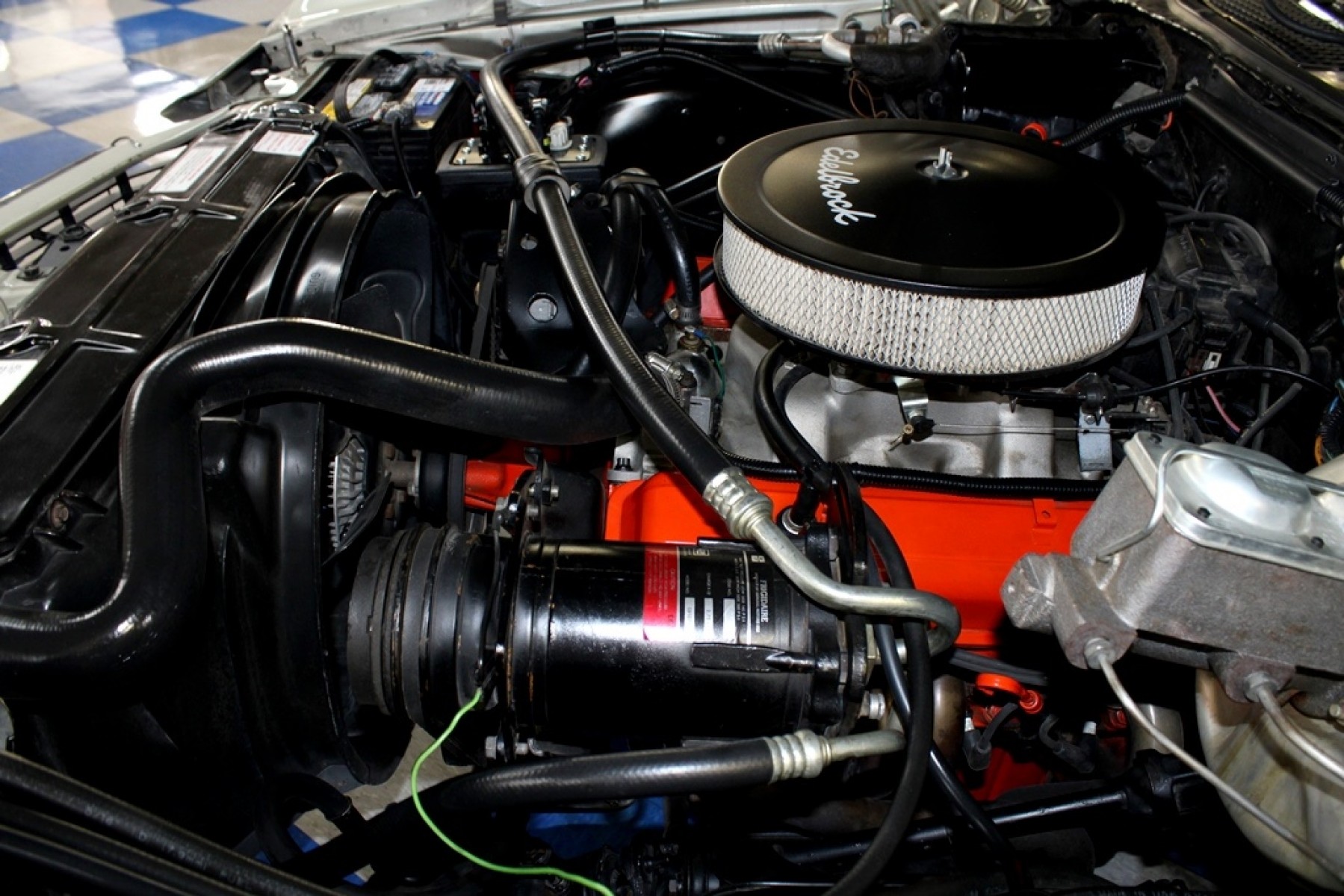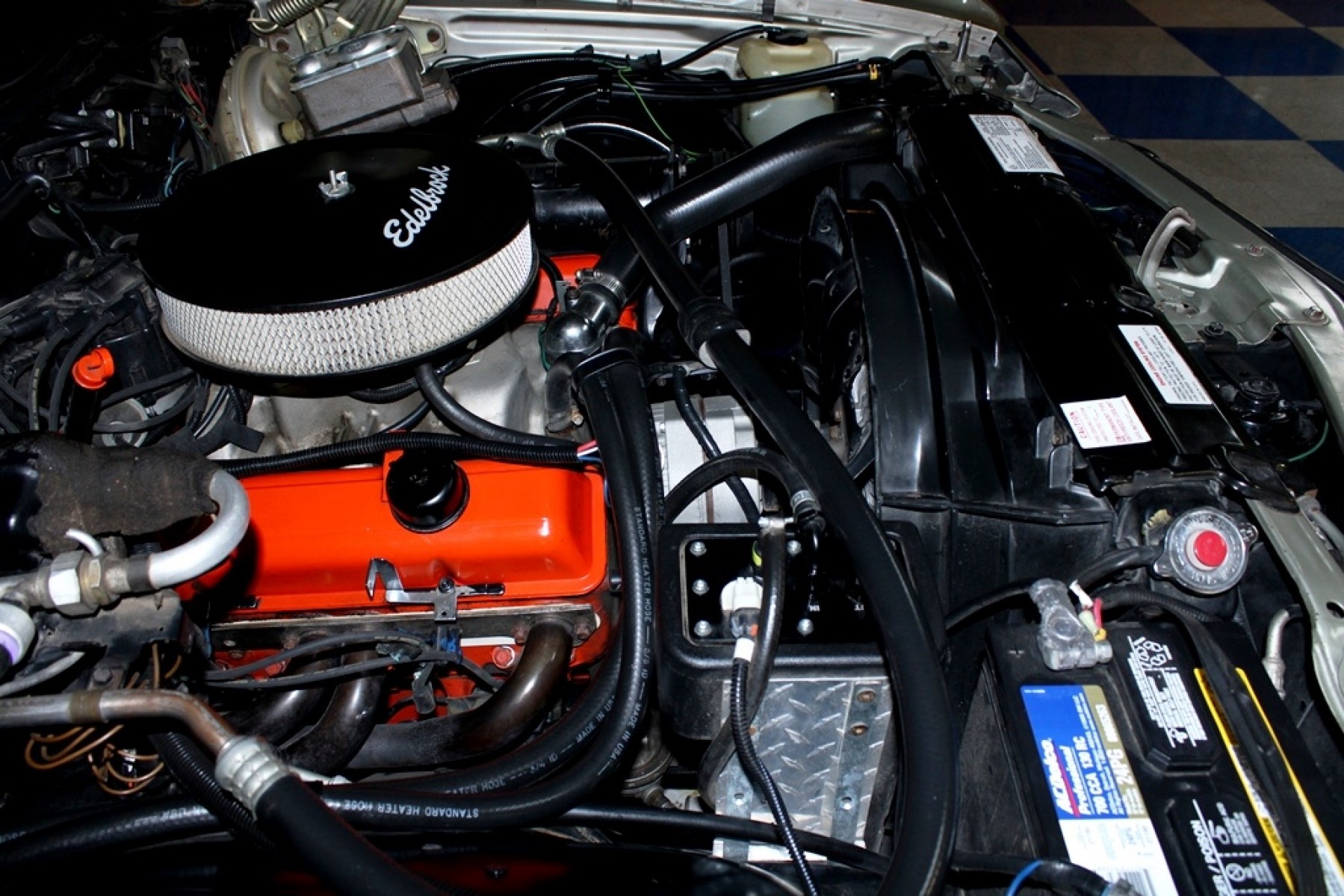 383 cui engine with Edelbrock E-street Throttle Body Fuel Injection. Automatic 700R4 OD transmission. 12 bolt rear end. Painted in factory color Pewter Silver (code 14) with Black stripes and Black vinyl top (code B). Black vinyl bucket seat interior (code 704) with center console. Power front disc brakes. Power steering. Factory Frigidaire A/C. Flowmaster dual exhaust with headers. Front / Rear sway bar. Weiand intake. HEI. Tilt column with SS steering wheel. Factory style gauge cluster with in-dash tachometer. Remote driver-side mirror. Power windows. Front / Rear lap belts. Kenwood AM/FM/Cassette radio with rear package tray speakers. Front bumper guards. Hood pins. SS badges. 15″ Rally wheels with Cooper Cobra Radial G/T’s.