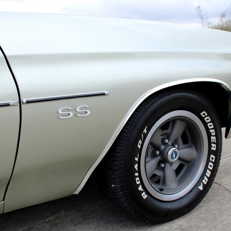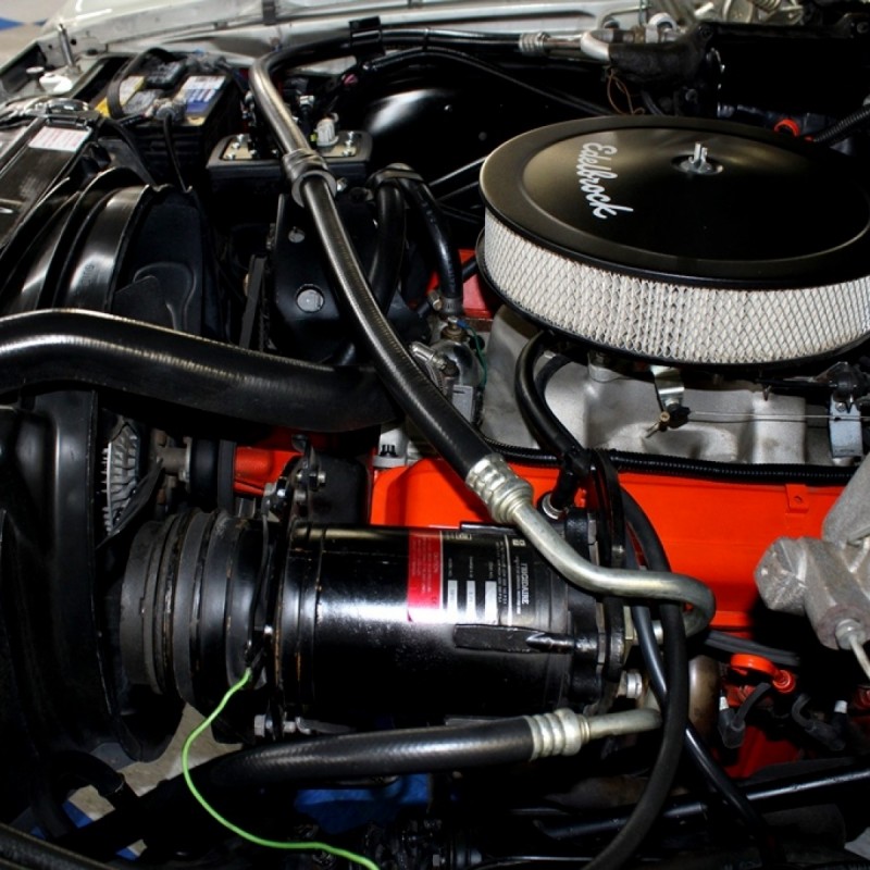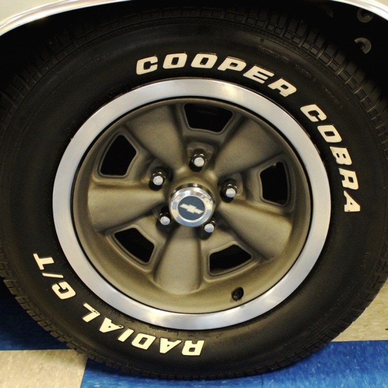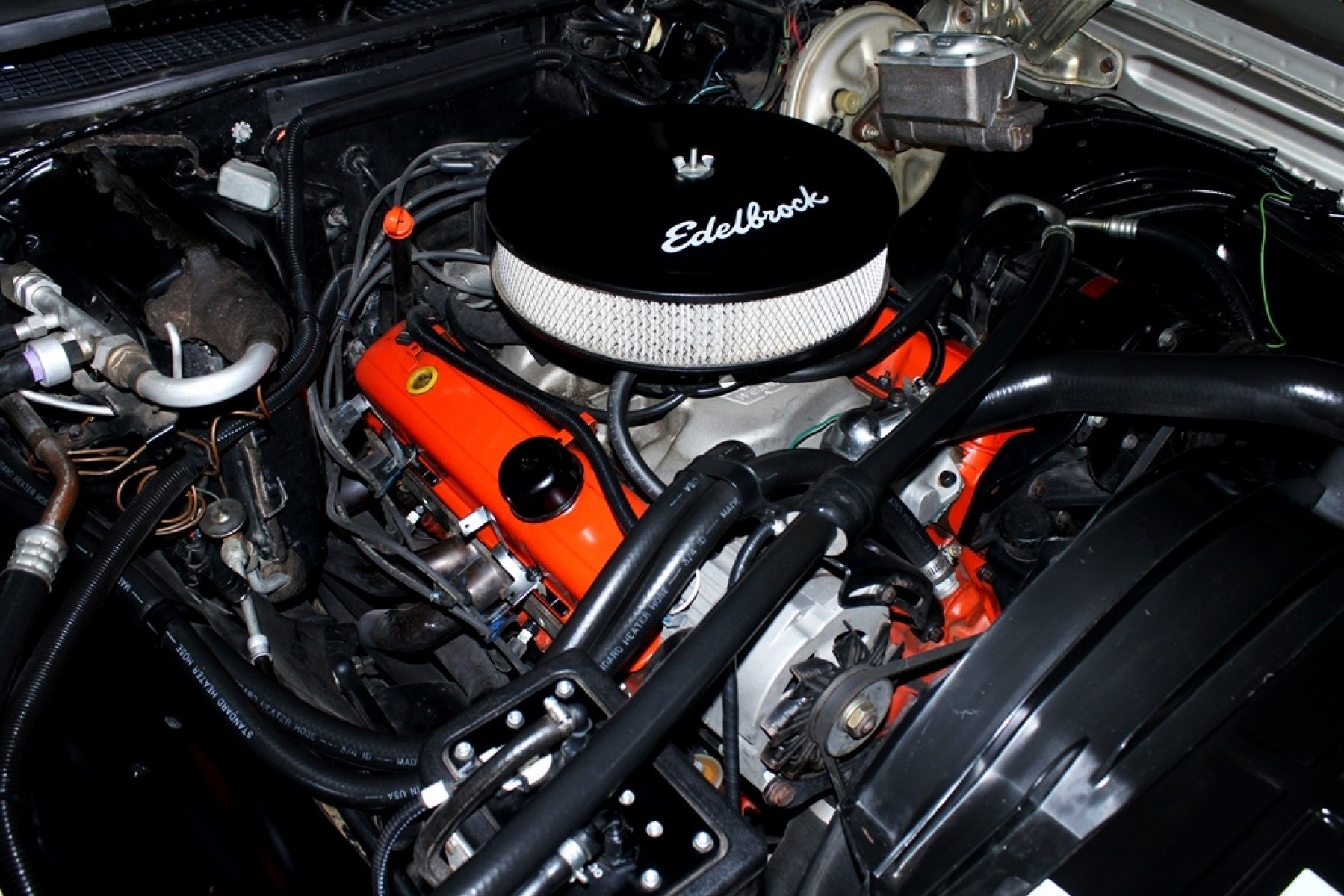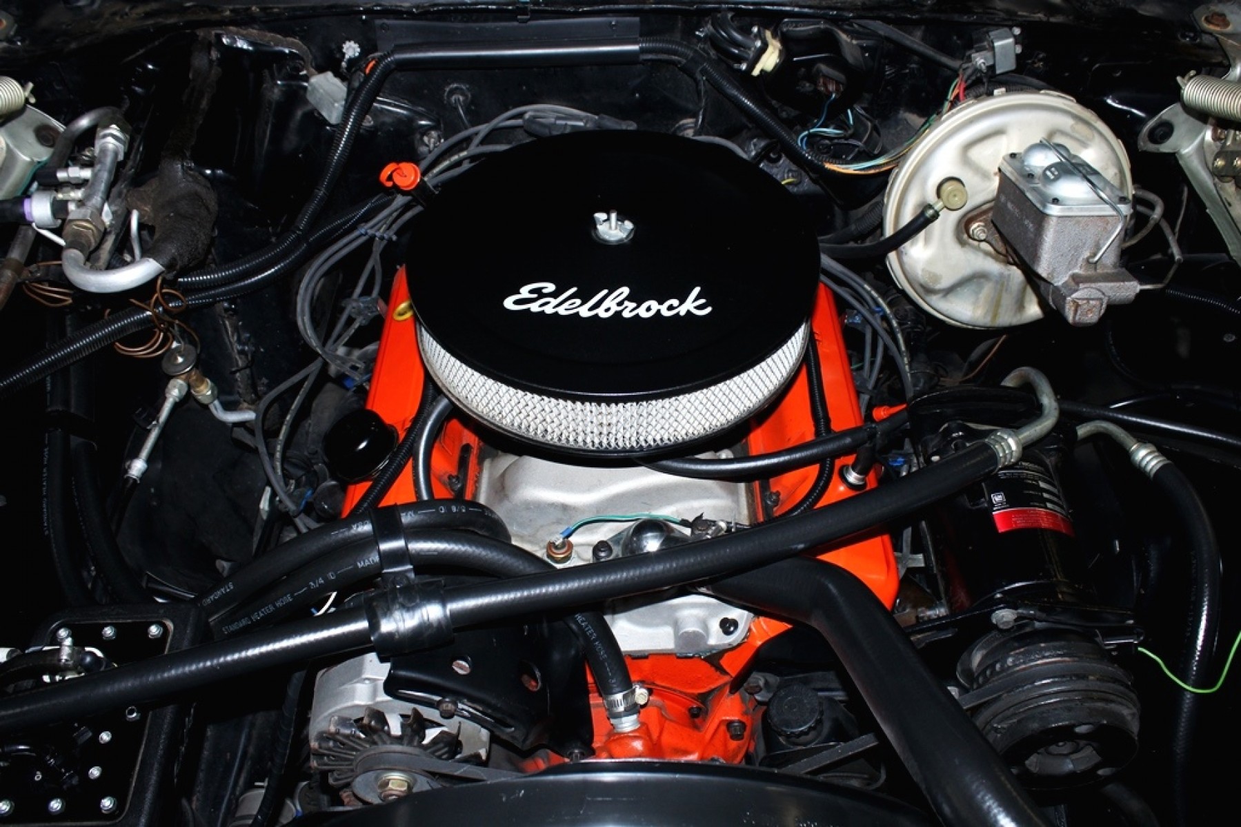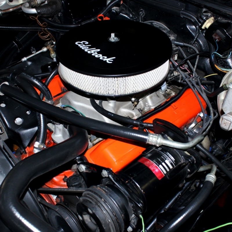 383 cui engine with Edelbrock E-street Throttle Body Fuel Injection. Automatic 700R4 OD transmission. 12 bolt rear end. Painted in factory color Pewter Silver (code 14) with Black stripes and Black vinyl top (code B). Black vinyl bucket seat interior (code 704) with center console. Power front disc brakes. Power steering. Factory Frigidaire A/C. Flowmaster dual exhaust with headers. Front / Rear sway bar. Weiand intake. HEI. Tilt column with SS steering wheel. Factory style gauge cluster with in-dash tachometer. Remote driver-side mirror. Power windows. Front / Rear lap belts. Kenwood AM/FM/Cassette radio with rear package tray speakers. Front bumper guards. Hood pins. SS badges. 15″ Rally wheels with Cooper Cobra Radial G/T’s.