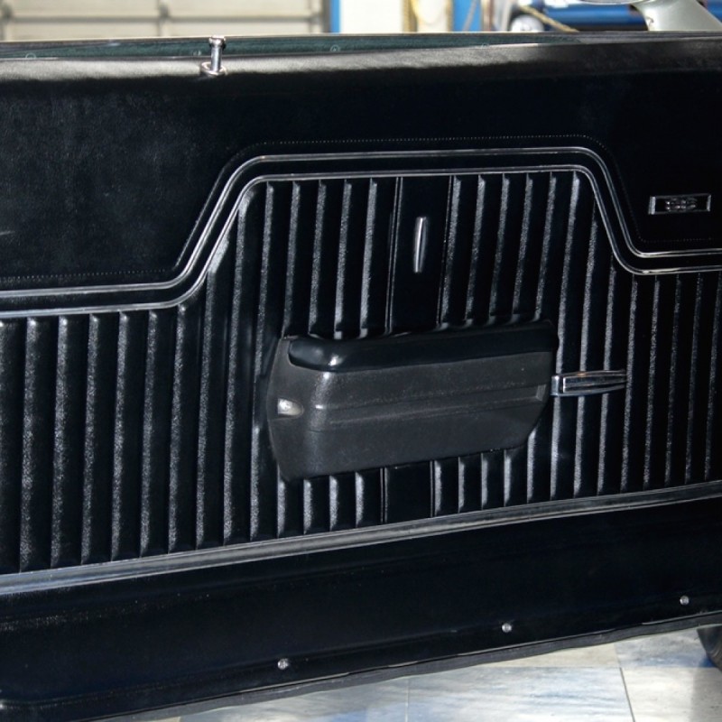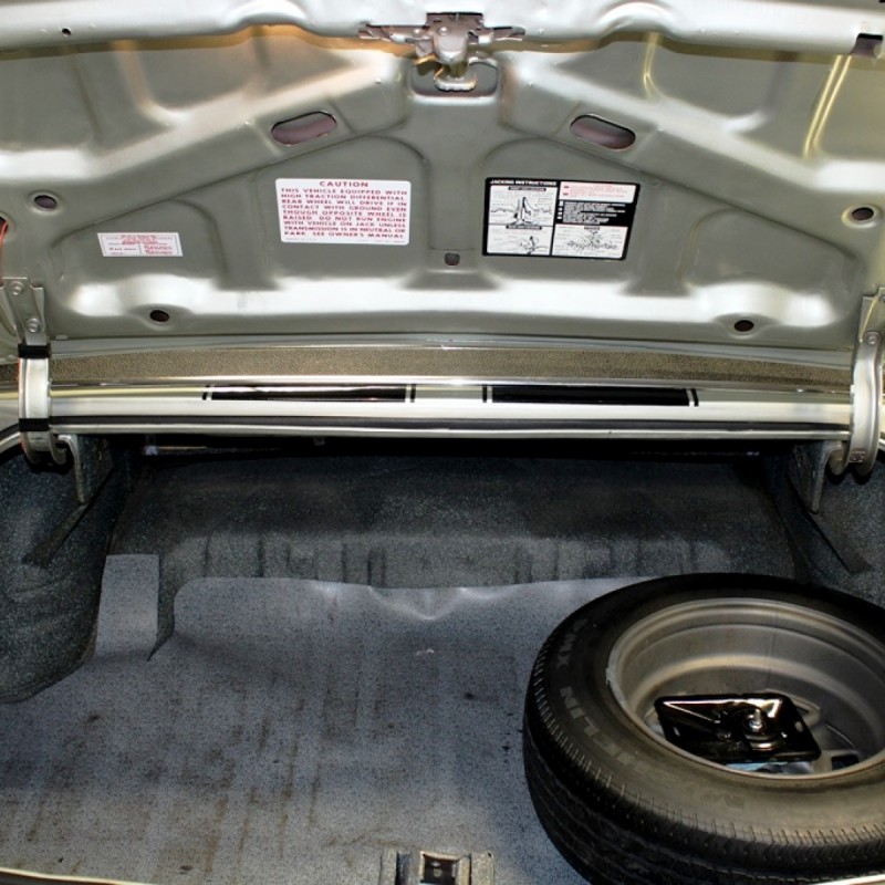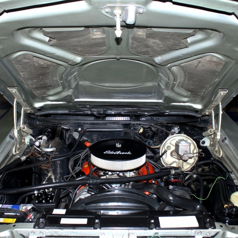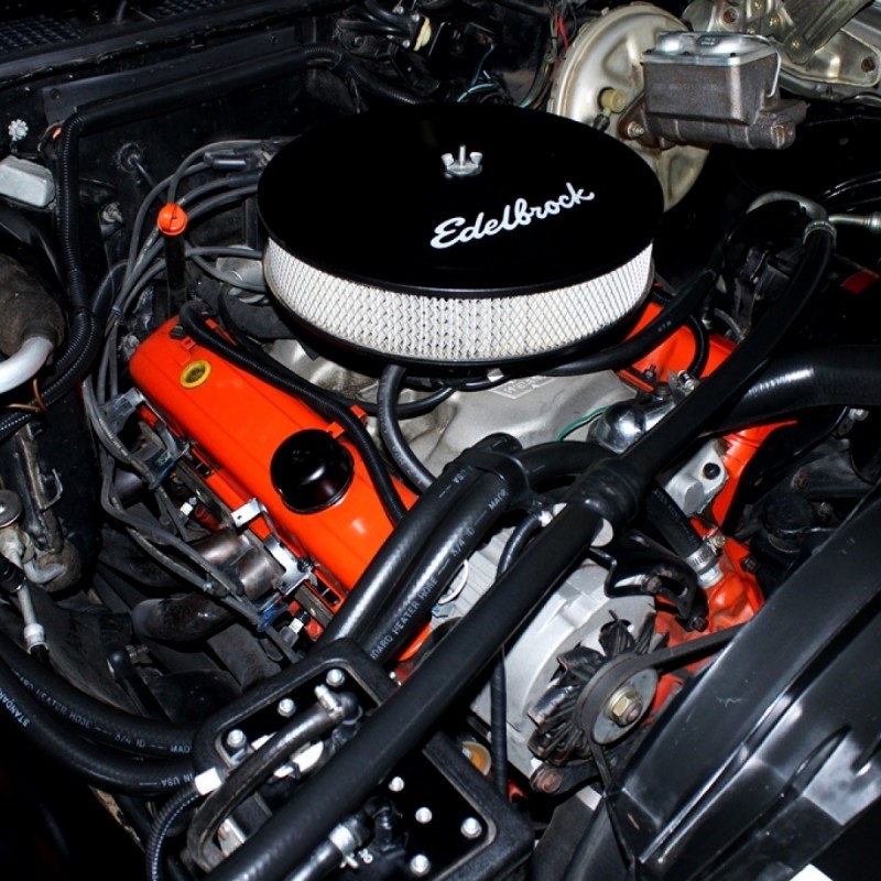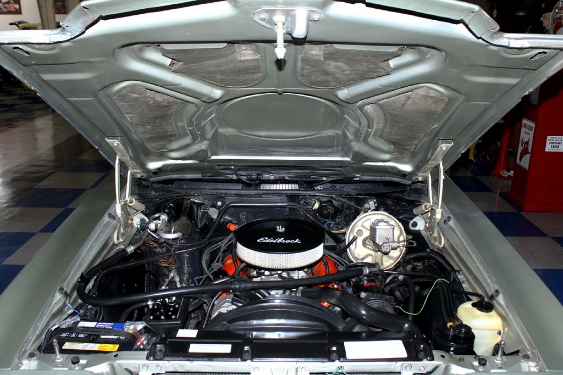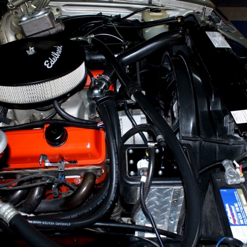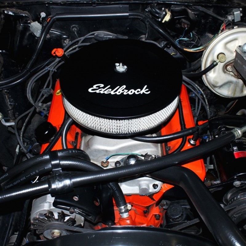 383 cui engine with Edelbrock E-street Throttle Body Fuel Injection. Automatic 700R4 OD transmission. 12 bolt rear end. Painted in factory color Pewter Silver (code 14) with Black stripes and Black vinyl top (code B). Black vinyl bucket seat interior (code 704) with center console. Power front disc brakes. Power steering. Factory Frigidaire A/C. Flowmaster dual exhaust with headers. Front / Rear sway bar. Weiand intake. HEI. Tilt column with SS steering wheel. Factory style gauge cluster with in-dash tachometer. Remote driver-side mirror. Power windows. Front / Rear lap belts. Kenwood AM/FM/Cassette radio with rear package tray speakers. Front bumper guards. Hood pins. SS badges. 15″ Rally wheels with Cooper Cobra Radial G/T’s.