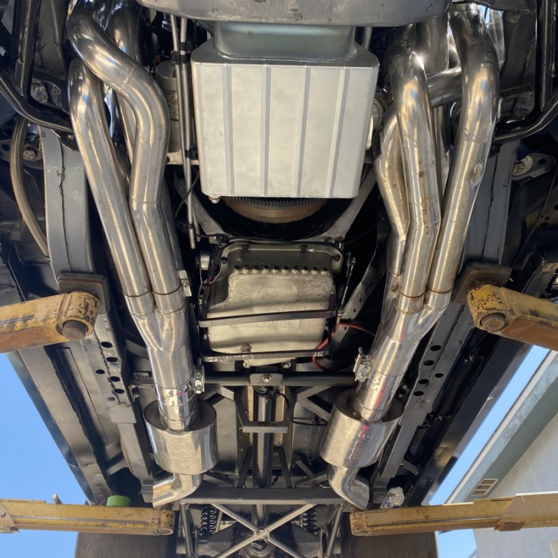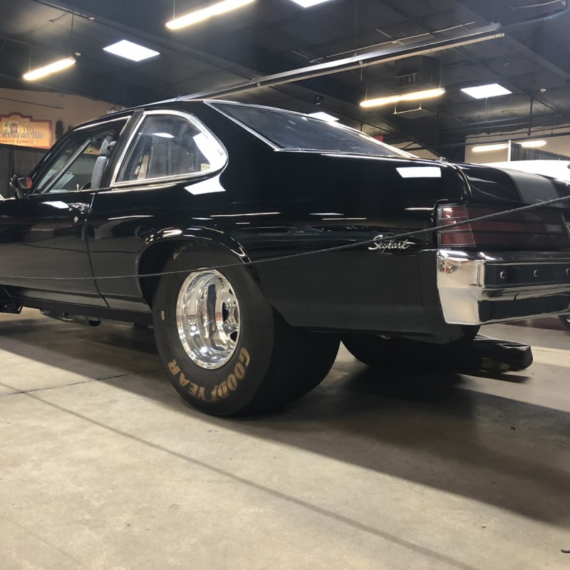 Suspension, Front QA1 coil over conversion, with QA1 tubular control arms, Rear Chassis works ladder bars with X-brace, QA1 adjustable shocks and springs, Chrome Moly wheelie bars.
