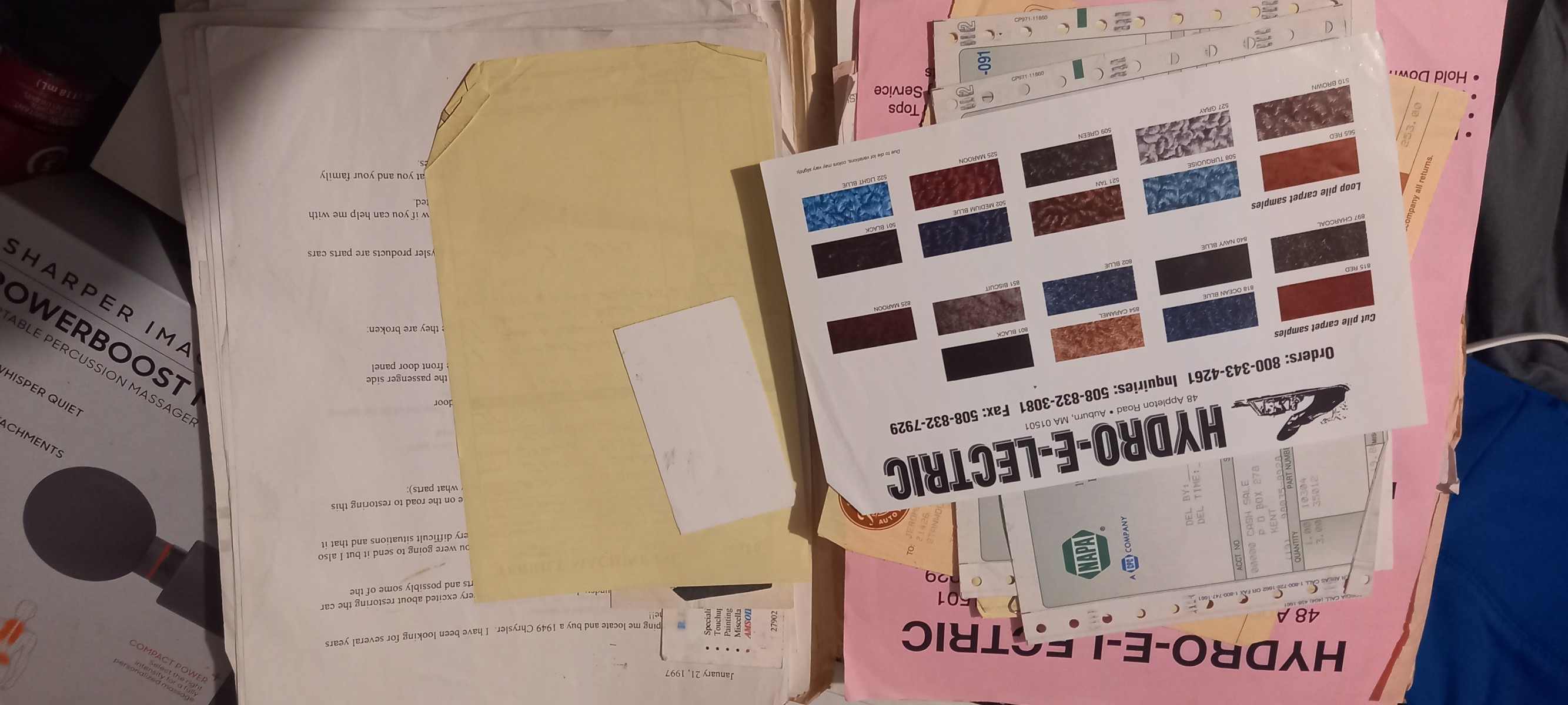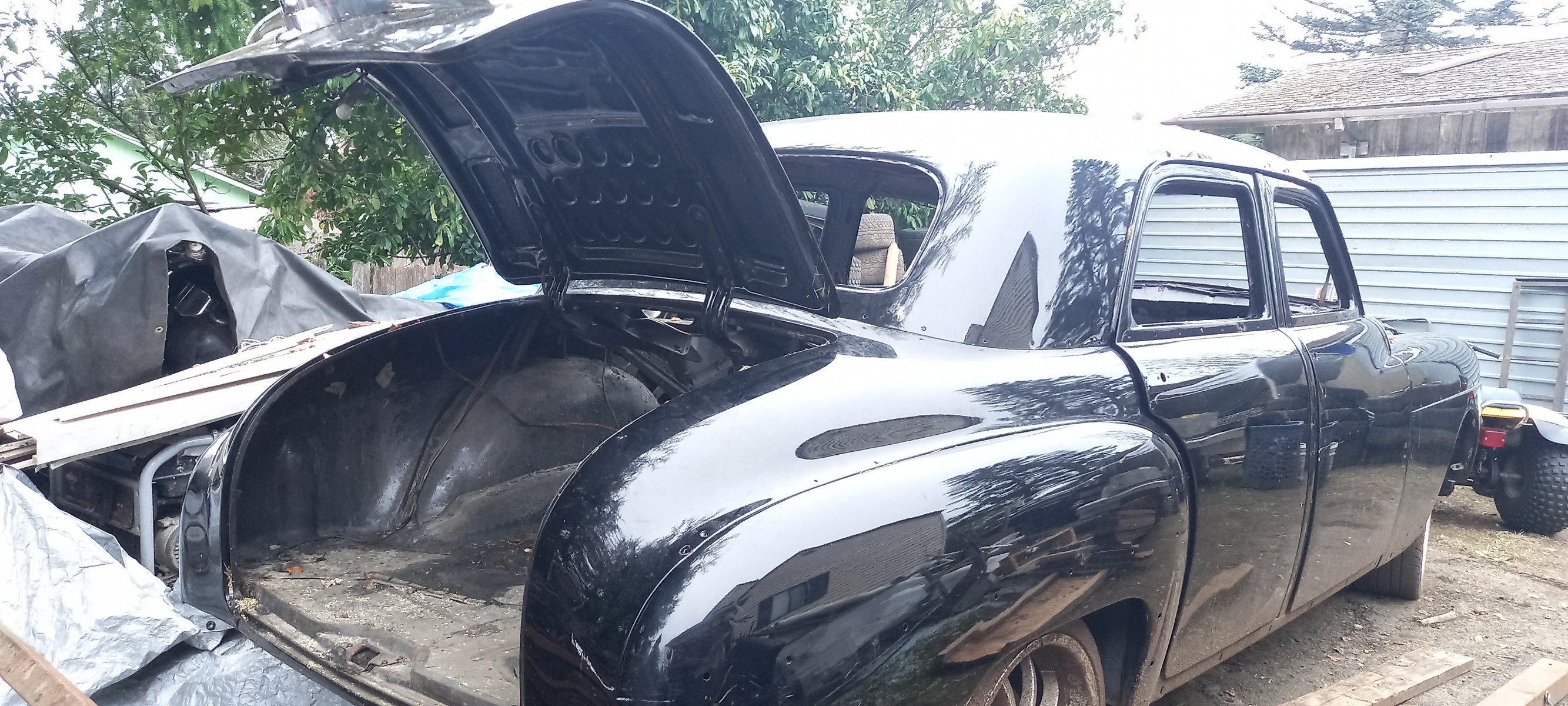 1949 black Plymouth sadan with a flat head strait 6 one owner. Engine is complete and zero miles, all interiors are plastic wrapped new, the trim and bumper has Been redipped and cromed. Wiring harness and diagrams are included. Everything to put it together. A man bought the car on his wedding day and died before he could put it back together some odd years later. Comes with a file of all the receipts and a brief history of the vehicle.