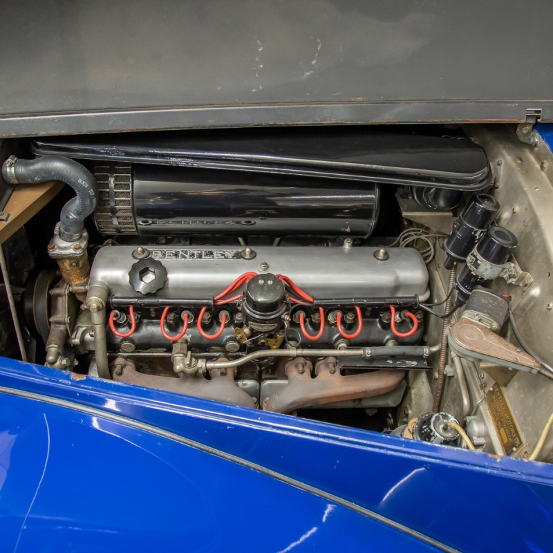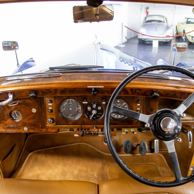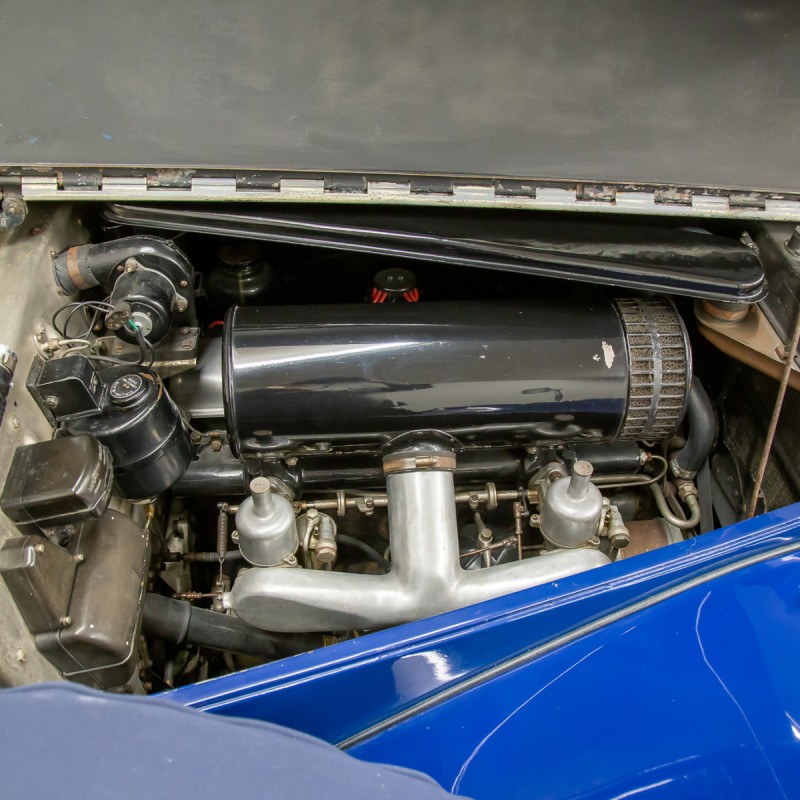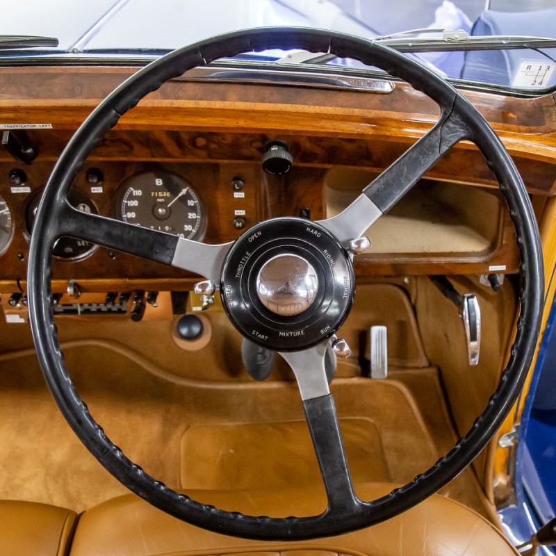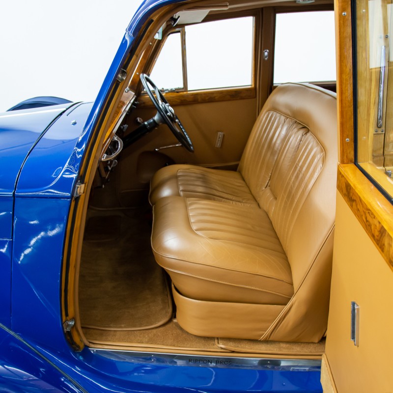 In this period the car was repainted in a Royal Blue scheme and its original upholstery was refurbished from a light blue to the more handsome contrasting dark tan it wears today. This work has now aged in places where it sees the most use, being around the hood latching areas and at the door surrounds. The woodwork appears to have been beautifully preserved and sympathetically refinished and is of particular appeal.