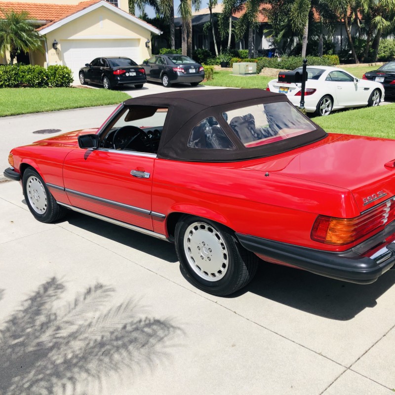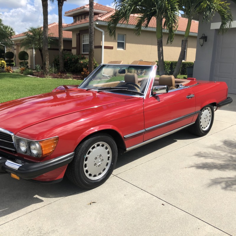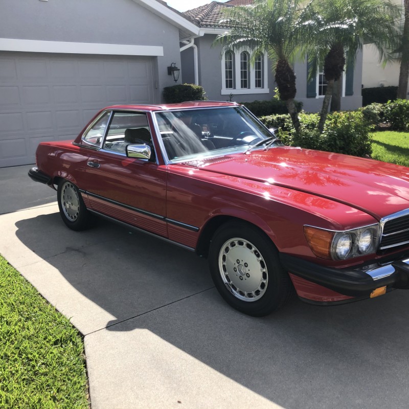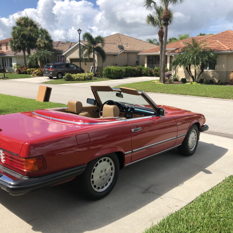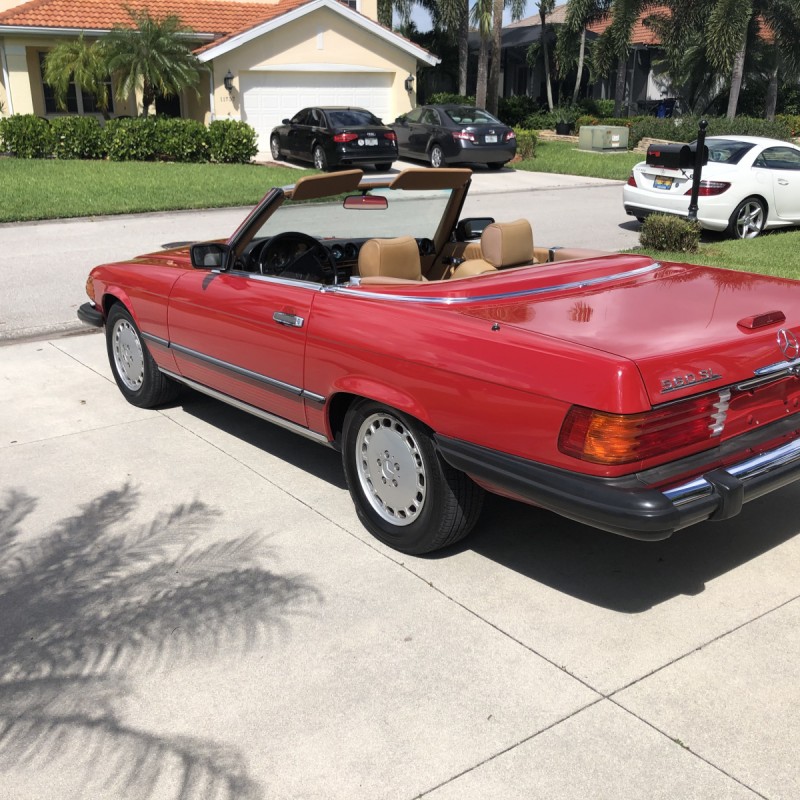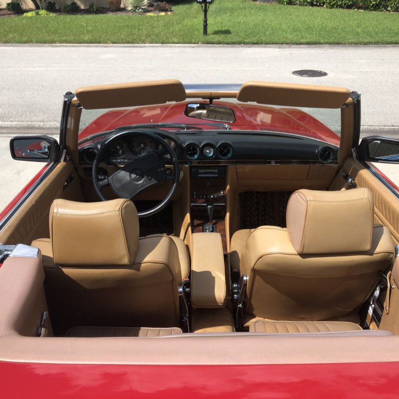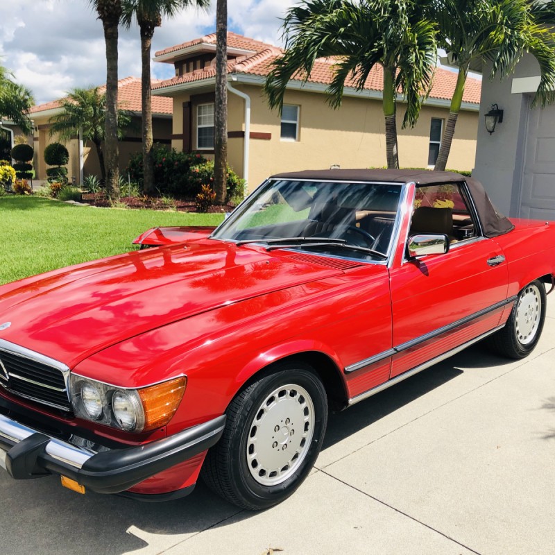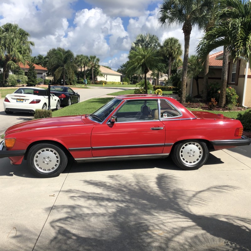 This 1988 Mercedes-Benz 560SL is finished in Signal Red over a Palomino leather interior. The car was purchased from a doctor and his wife in Sarasota, Florida in August 2018. It was meticulously maintained and I spoke with the mechanic that serviced the car and I have all the service records. Power is provided by 5.5-liter V8 paired with a four-speed automatic transmission. Maintenance in the last two years has included a transmission service and a new air filter, fuel filter, and spark plugs. Now showing 29k miles, this R107 SL is now offered with a matching factory hardtop, the factory tool roll, a car cover, manufacturer’s literature, service records, a clean Carfax report, and a clean Florida title in the seller’s name.