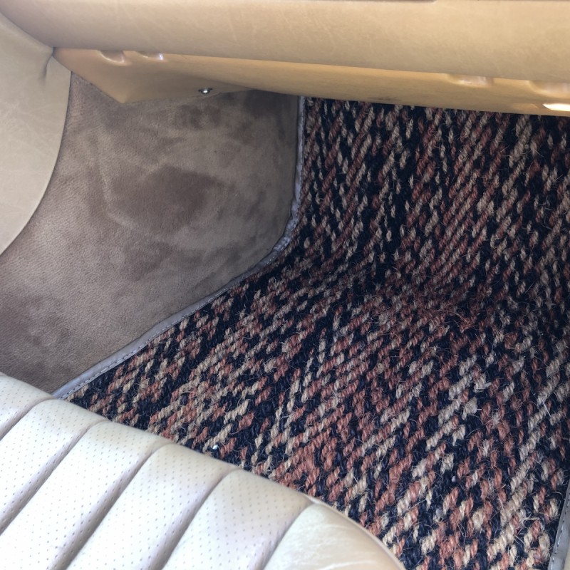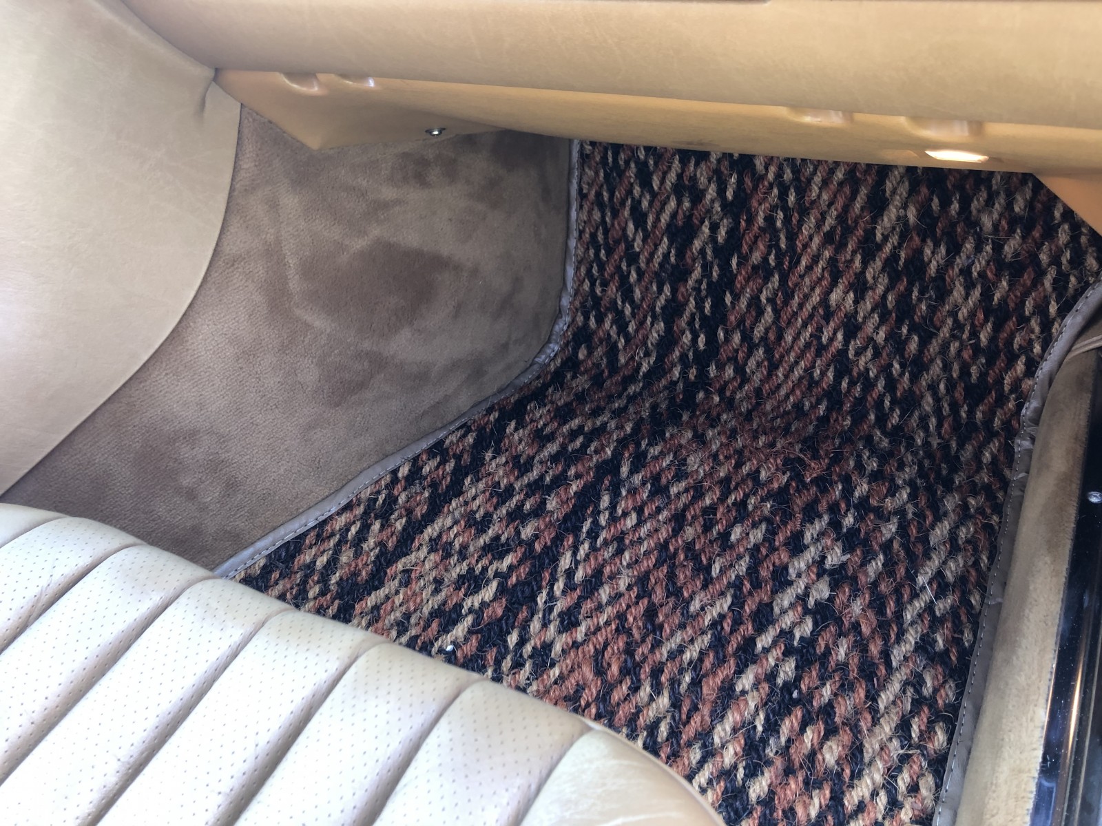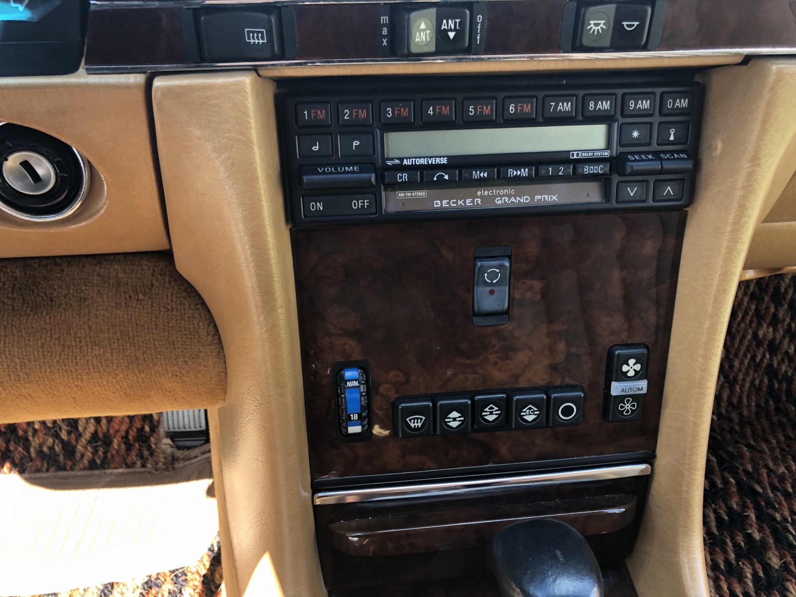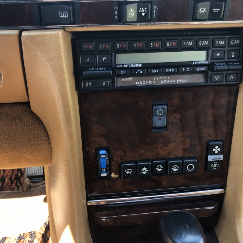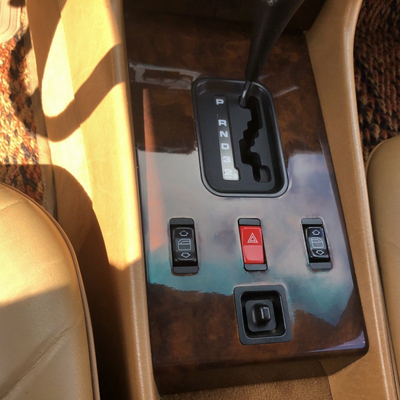 The interior is upholstered in Palomino leather with a matching dashboard and door panels. Equipment includes burl wood trim on the center console, air conditioning, cruise control, a Becker Grand Prix stereo, and power windows, locks, and mirrors.