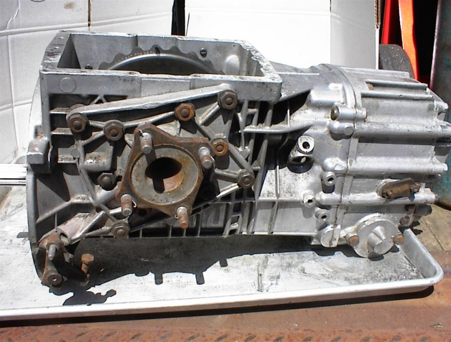 This is a ZF 25DS-25-0 transaxle as used in the original Ford GT-40's and some Lotus's and could work in a Mangusta. It is a 4 bolt case with external shifter linkage and aluminum side bearing/ axle retainers. It has a 3:44-1 ring-pinion ratio. No signs of case repair or damage. Unit is complete including the drive flanges but less the bell-housing. The top cover has the mounting ears and the mounting holes are 9" apart. The drive flanges are 4 bolt like on a Mangusta. This ZF did not have a I.D. tag. I.D. was stamped on top of the casebehind the top cover. The ring & pinion look new and have grease to keep off any moisture.