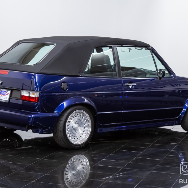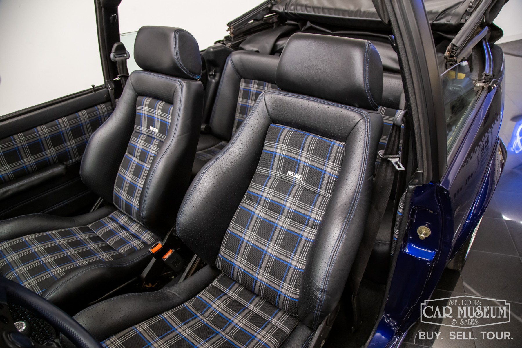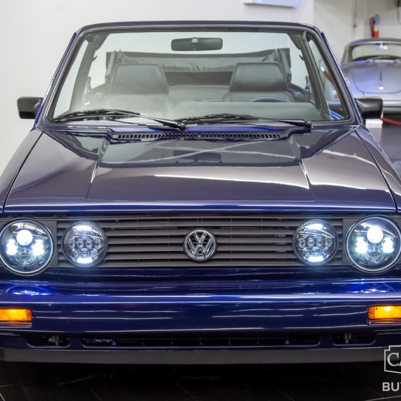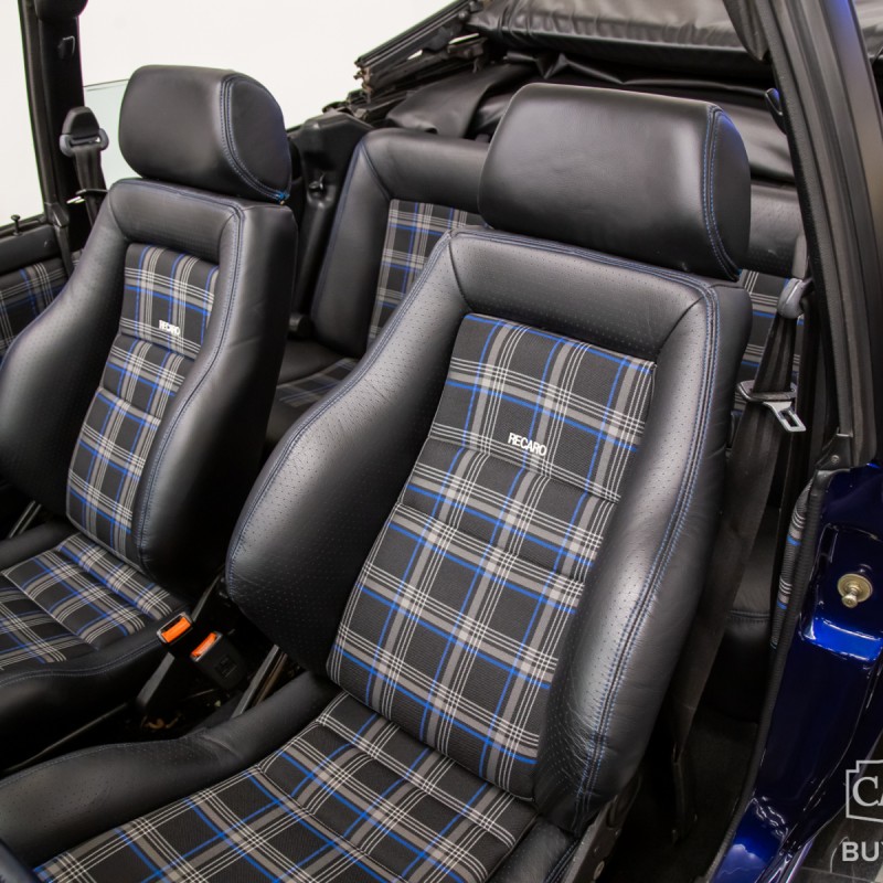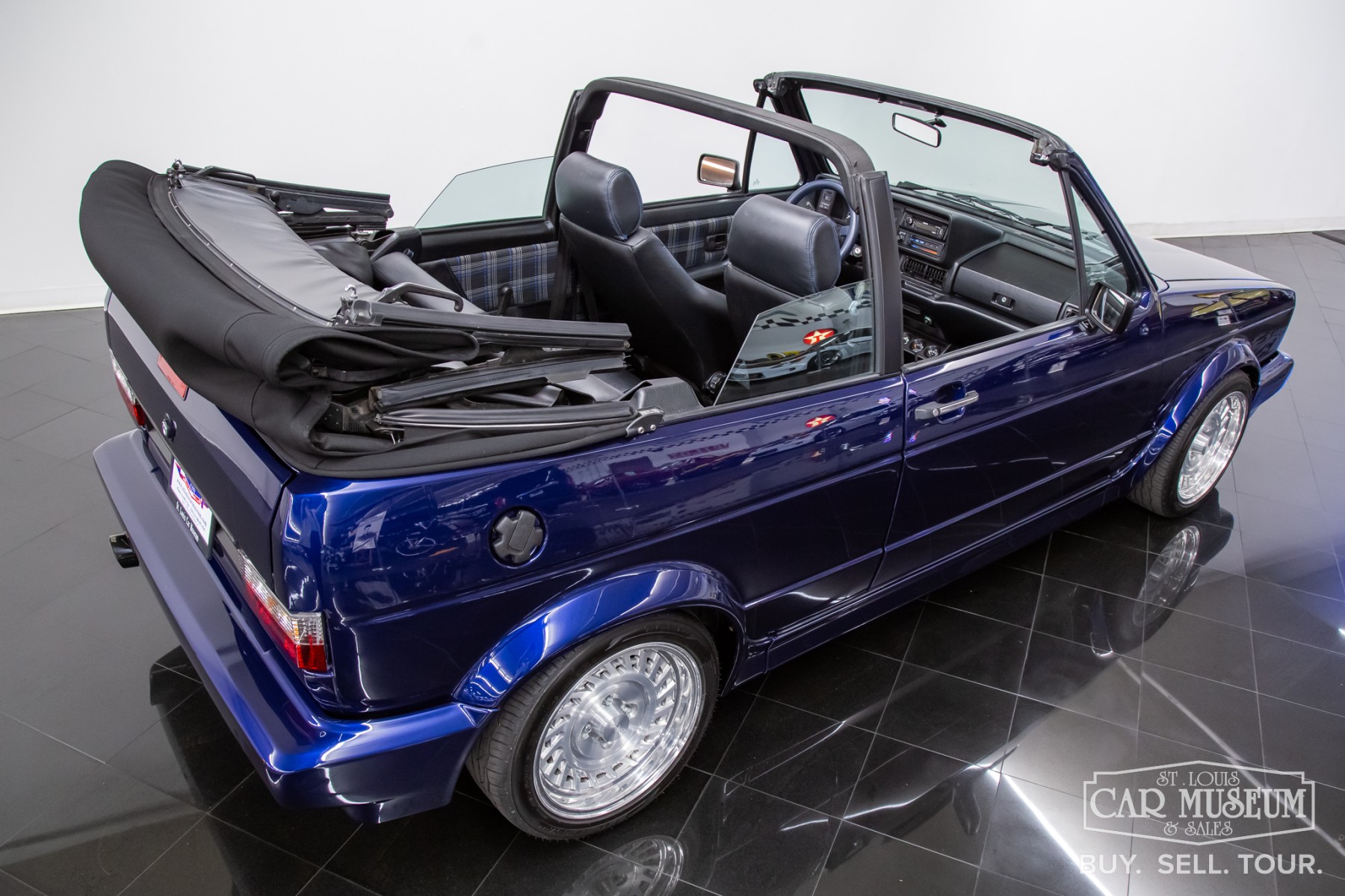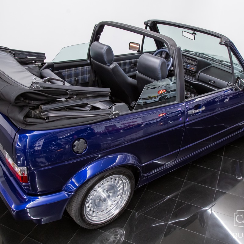 1991 Volkswagen Golf Cabriolet for sale professionally refinished in Navarra Blue Metallic over special Blue Plaid cloth interior. Its current owner initiated a complete custom restoration with the help of All German Performance based in Ashville, NC in 2020. Beginning with a super solid Etienne Aigner Edition Cabriolet in original Midnight Blue, they would immediately have the original engine and transmission removed, and the body sent to C&M Paint Werks in Weaverville, NC for a complete strip to bare metal. Once returned to the team at All German Performance, it was already prepped to receive a new Mk4 GTI 2.0L Turbo-charged engine/transmission transplant in place of the original motor. It would be fitted with S&P Automotive swap kit along with their aluminum radiator/intercooler assembly, remote coolant bottle expansion tank, and more! The results come from a full 2-year effort finished in 2022, and it has been driven and enjoyed only sparingly since completion. It boosts 180 factory rated horsepower without any internal modifications to the stock GTI drivetrain, with the exception to a S&P Automotive engine harness and ECU tune for optimum performance. Inside, the custom blue plaid material was sourced directly from Germany, then sent along with the Mk1 seat frames and Recaro seats to GTS Classics in Austin, TX to be reupholstered and professionally upfitted. Full build specs, photos and more @ stlouiscarmuseum.com.