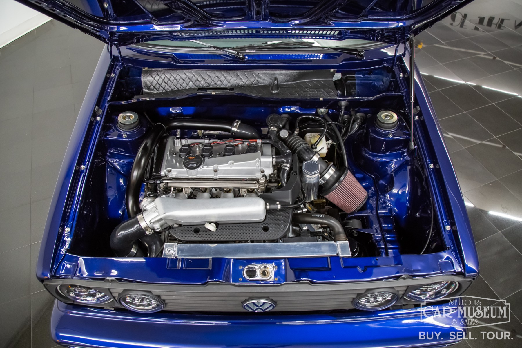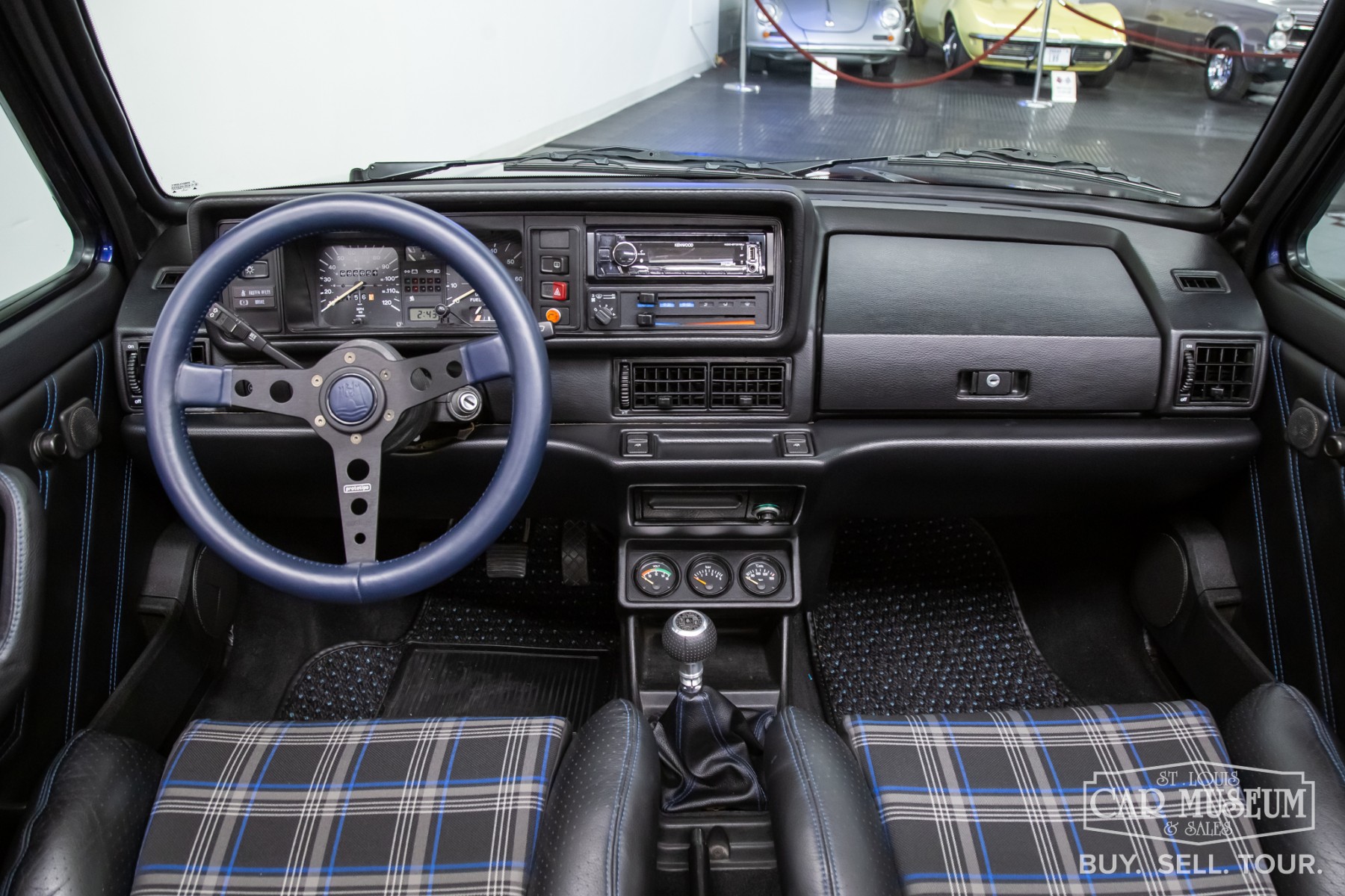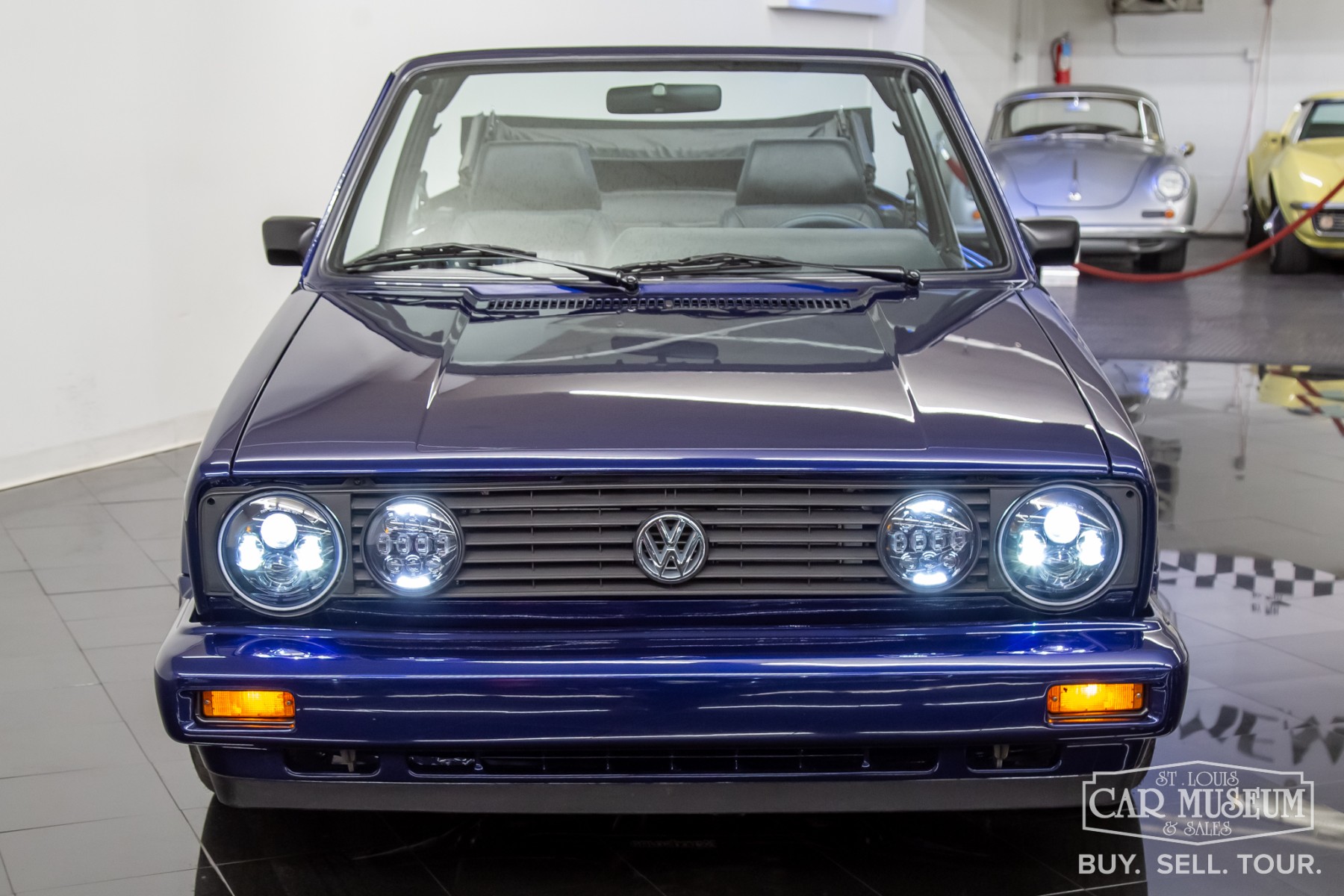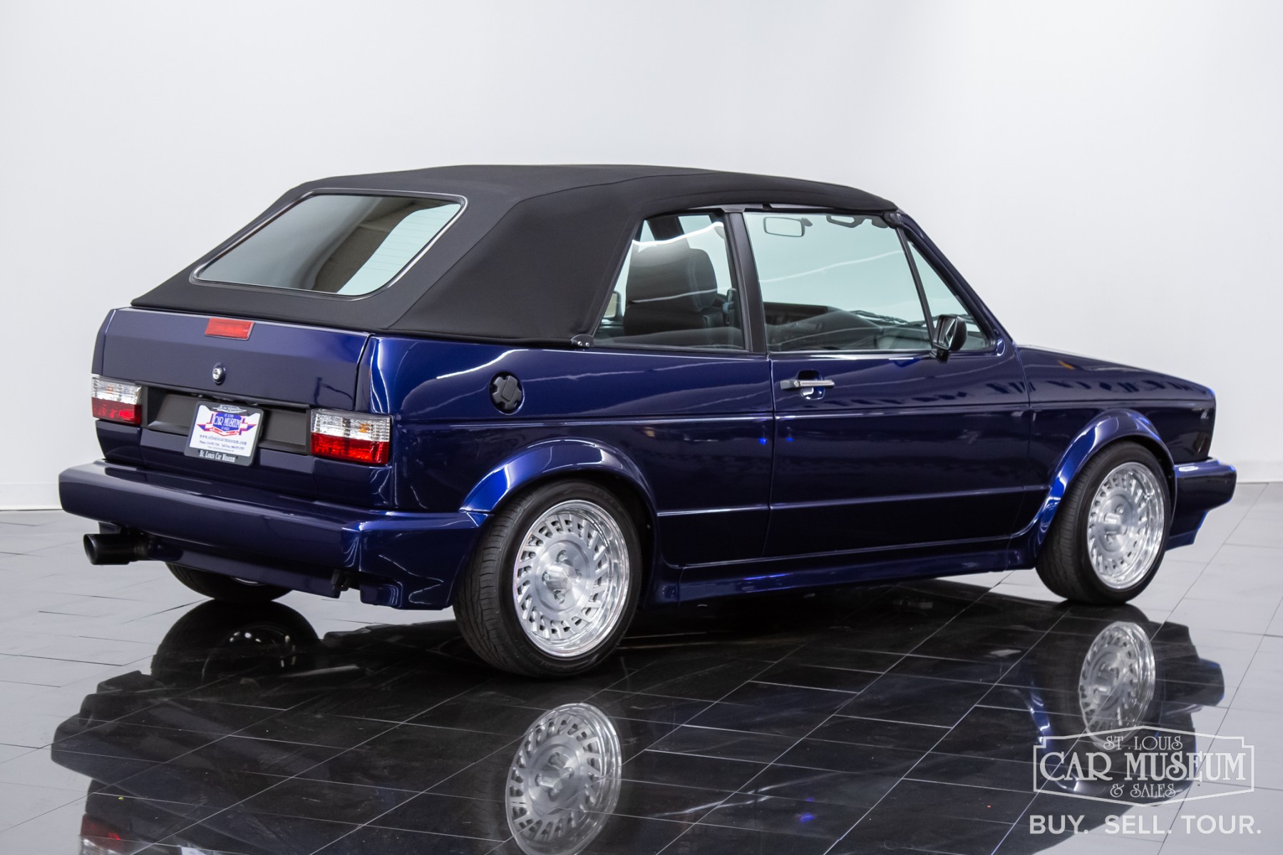 1991 Volkswagen Golf Cabriolet for sale professionally refinished in Navarra Blue Metallic over special Blue Plaid cloth interior. Its current owner initiated a complete custom restoration with the help of All German Performance based in Ashville, NC in 2020. Beginning with a super solid Etienne Aigner Edition Cabriolet in original Midnight Blue, they would immediately have the original engine and transmission removed, and the body sent to C&M Paint Werks in Weaverville, NC for a complete strip to bare metal. Once returned to the team at All German Performance, it was already prepped to receive a new Mk4 GTI 2.0L Turbo-charged engine/transmission transplant in place of the original motor. It would be fitted with S&P Automotive swap kit along with their aluminum radiator/intercooler assembly, remote coolant bottle expansion tank, and more! The results come from a full 2-year effort finished in 2022, and it has been driven and enjoyed only sparingly since completion. It boosts 180 factory rated horsepower without any internal modifications to the stock GTI drivetrain, with the exception to a S&P Automotive engine harness and ECU tune for optimum performance. Inside, the custom blue plaid material was sourced directly from Germany, then sent along with the Mk1 seat frames and Recaro seats to GTS Classics in Austin, TX to be reupholstered and professionally upfitted. Full build specs, photos and more @ stlouiscarmuseum.com.