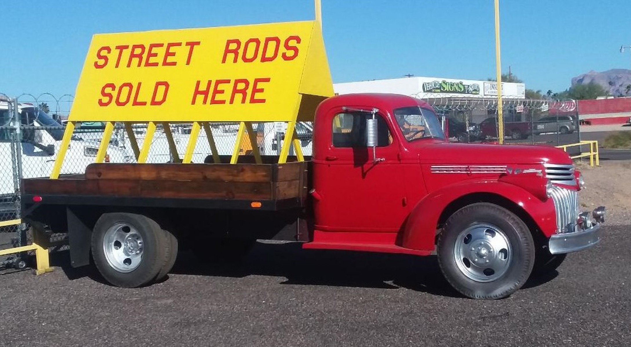 UNBELIEVEABLE 1946 CHEVROLET DUALLY TRUCK — Incredible Rust Free Condition. Starts, Runs, Drives! Inline 235 CID Engine With A Garrison Dual Shifter 8 Spd Manual Transmission. Appears To Be All Factory Except For 12 Volt Conversion, Recent Steel/Wood 12 Ft Flatbed With Tool Box, And One Prior Repaint In Red, As Shown. Original Green Paint Visible In Rust Free Door Jambs. This Truck IS 100% Complete With All Emblems, Trim, Factory Dash And Glove Box, Grill, Floor Starter Knob, Even What Appears To Be Original Seat (reupholstered) And Outside Mirrors. Absolutely Rust Hole Free Body, Including Factory Running Boards, Bottom Of Doors, Door Jambs, Cab Corners, ETC. Engine Burns Oil And Has Some Leaks, But Starts On It’s Own! Clutch Appears To Be In Proper Working Condition. We Obtained This Truck From The 2nd Owner In Prescott Arizona Area, Complete With An Arizona Title. This Could Easily Be One Of A Handful Of These Trucks In This Condition In The World!