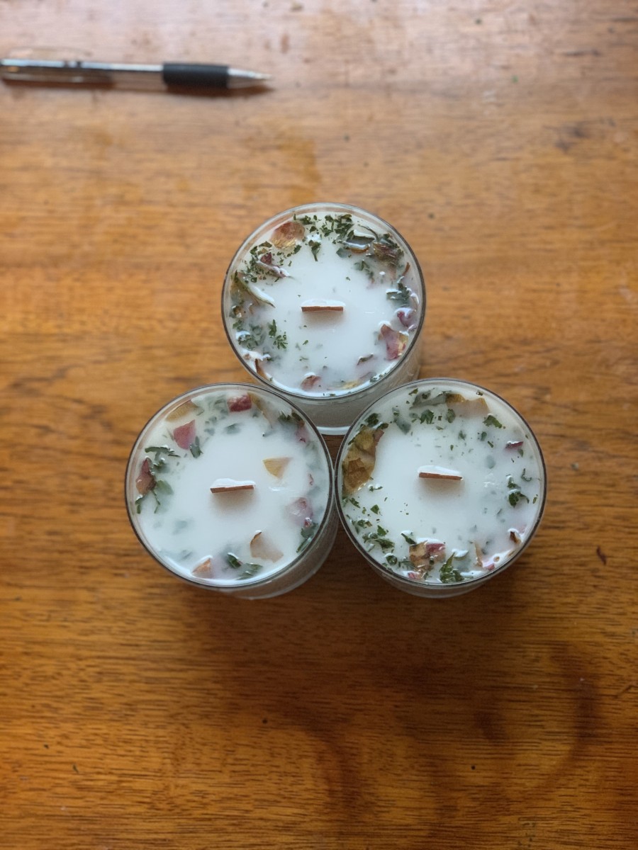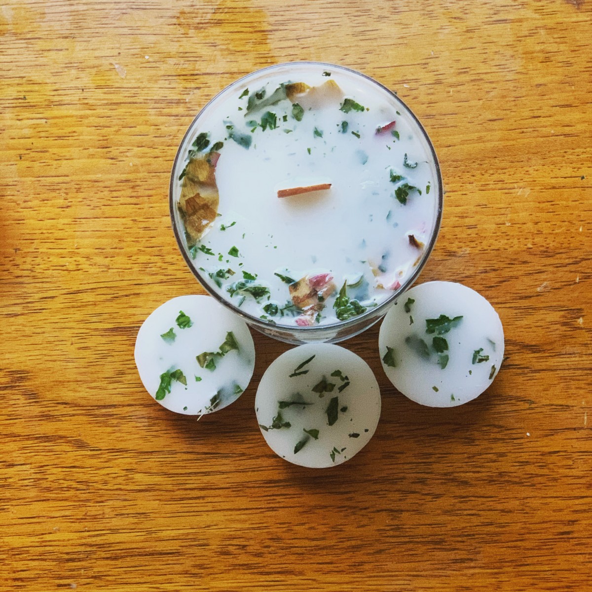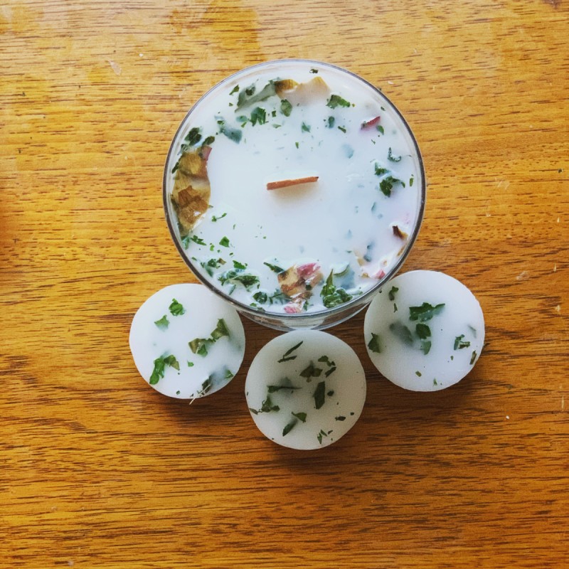 You get 1 candle and 3 melts for $13!Beautiful candles scented with cannabis rose and topped with dried roses and dried marijuana leaves centered with a crackling wood wick.