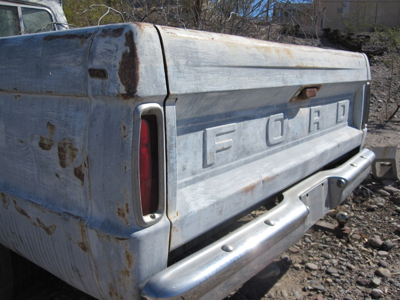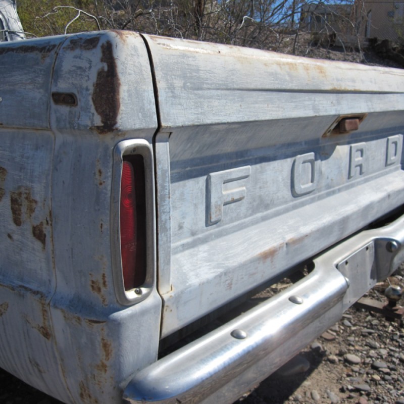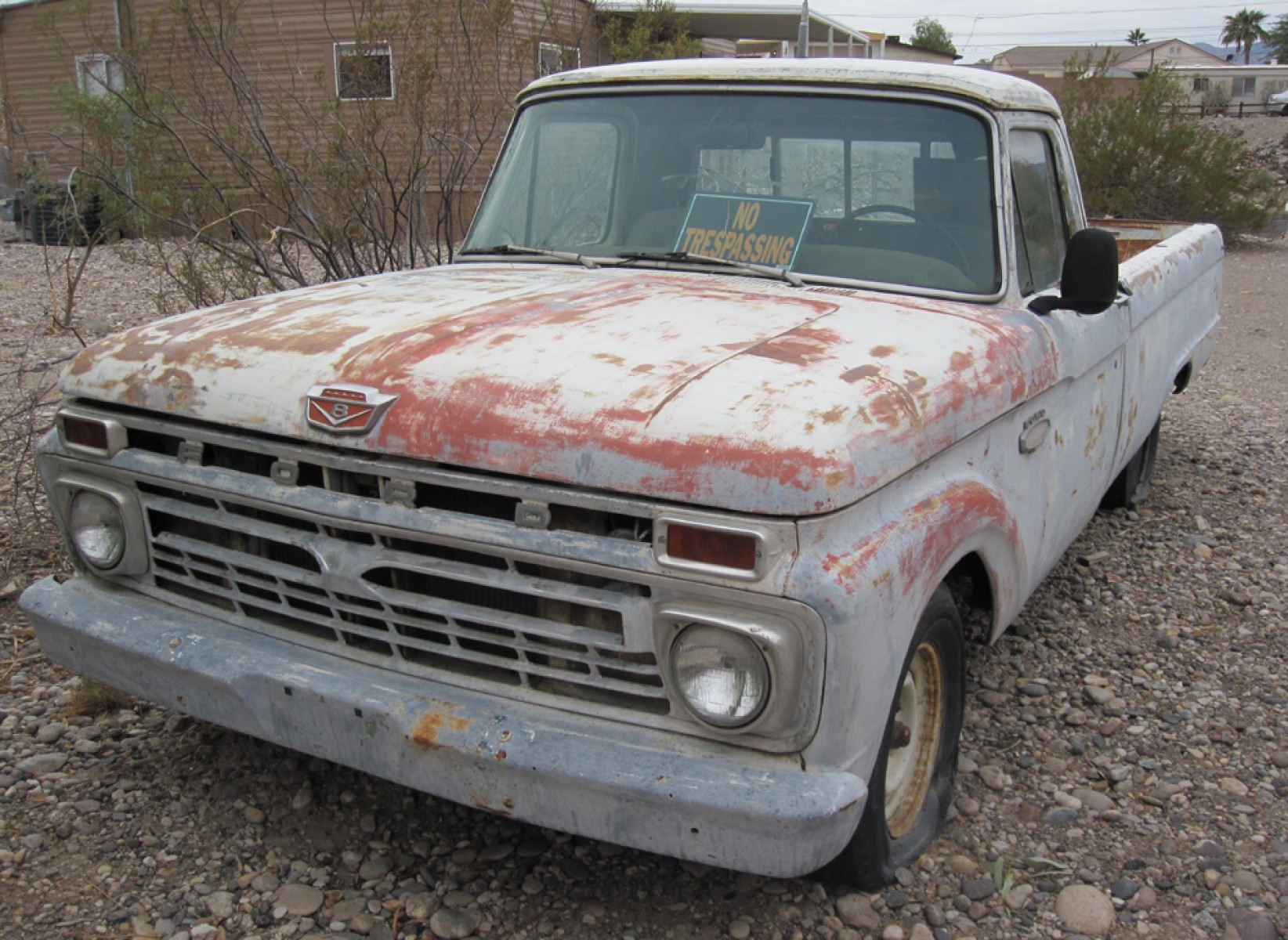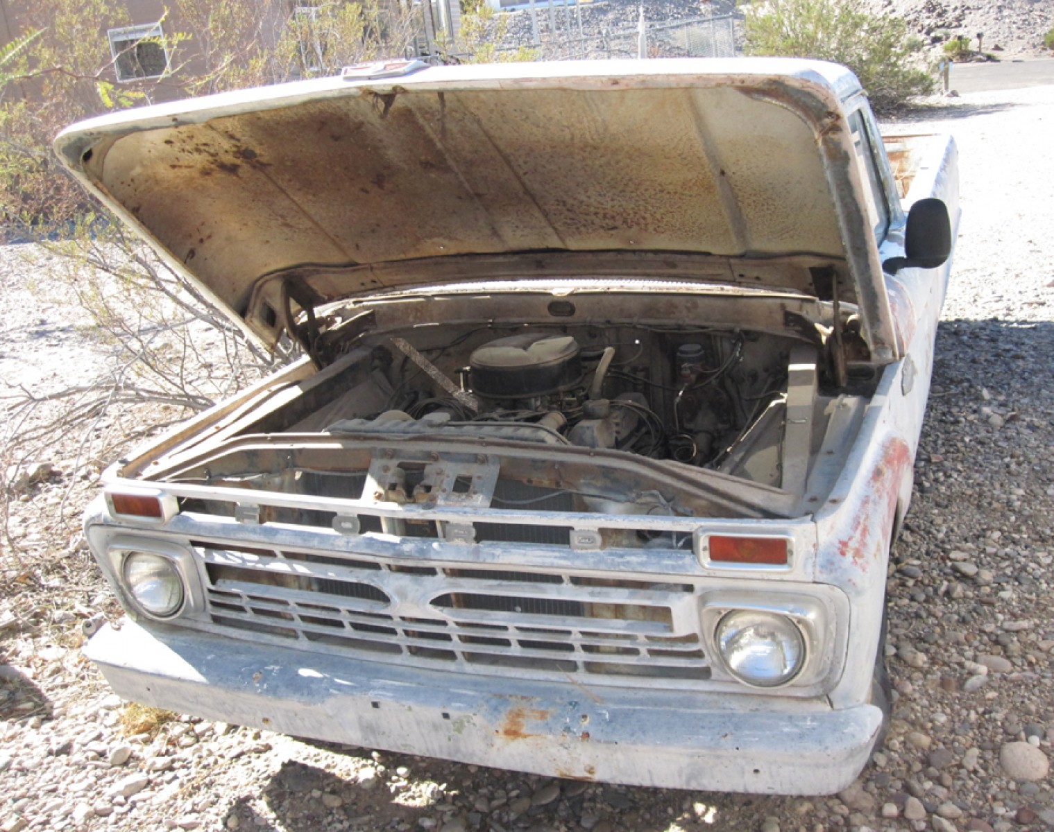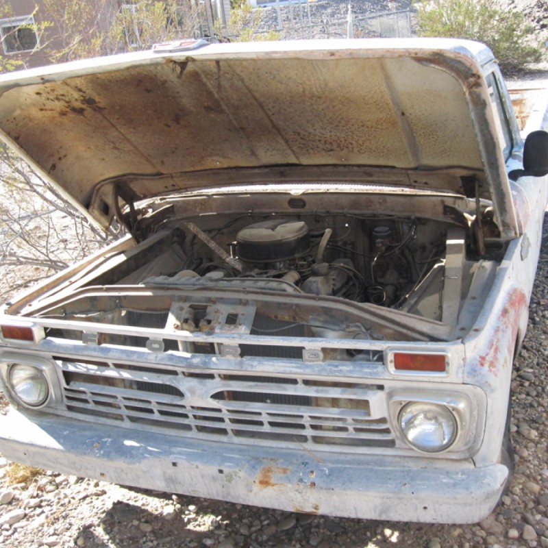 1966 Ford F-100 Custom Cab Styleside pickup with twin I-beam suspension, last year this model was manufactured. Original 352 V-8 engine, 3-speed automatic transmission with overdrive and factory towing package. Original engine and drive train. This classic truck has original oil-bath air cleaner and 2-barrel carb. Last driven in 2012, less than 3,000 miles on top-end engine rebuild. Has been stored outdoors in Arizona. New (rebuilt) alternator still in the box is included, needs battery and fan belts. Engine should run great with flush and new fluids. Lights, turn indicators and all gauges (except fuel gauge) are functional. Great project truck that needs minimal work to get on the road! Tires rotted from sitting but rims are good. Only non-original parts are rear window (was replaced with slider), seat and side mirrors, original mirrors included (see photo). Body is straight and solid, only cosmetic rust. Bed is solid but has a couple of small rust-through spots. Two body defects: small dent in hood that was popped out 30 years ago, and dent in passenger side near factory-installed in-bed tool box (see photos). This truck has been in the family since the early 1980s and was driven when carrying capacity was needed through 2012 when we bought another pickup that had A/C. Clear Arizona title. Sold as-is, buyer must transport.