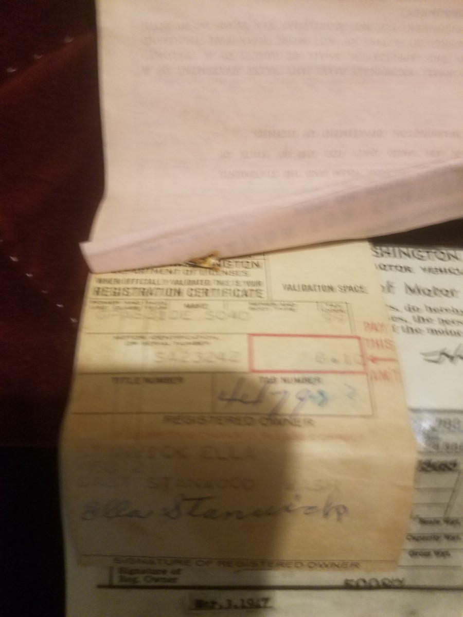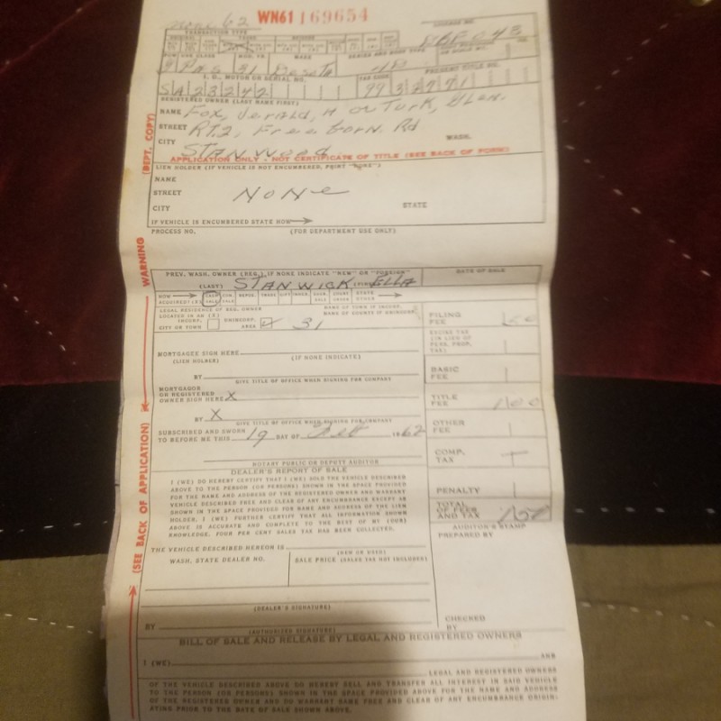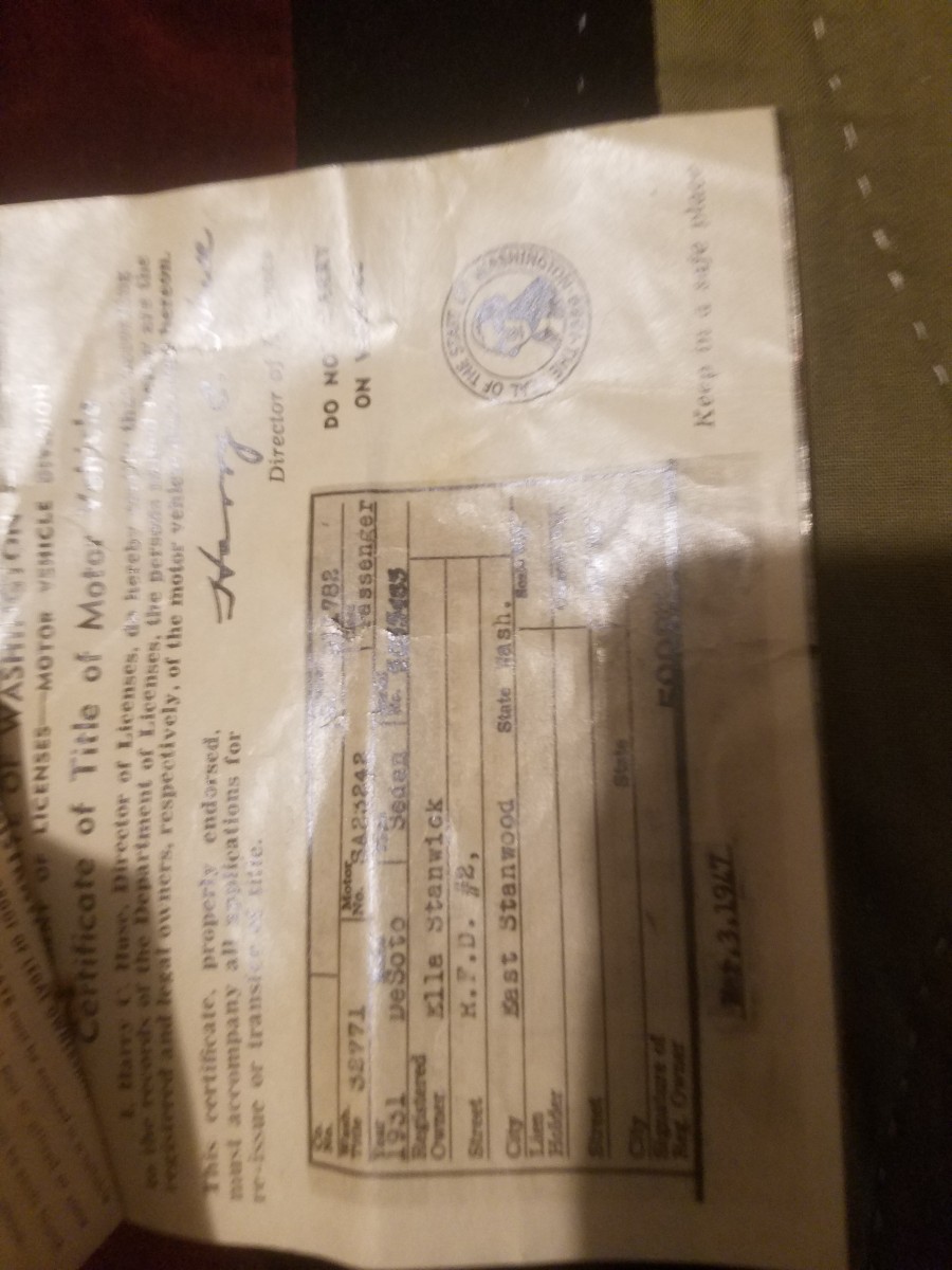 Washington State title for a 1931 Desoto Sedan dated March 3, 1947, 1974 registration, and title application triplicate forms all with Stanwood Washington addresses.