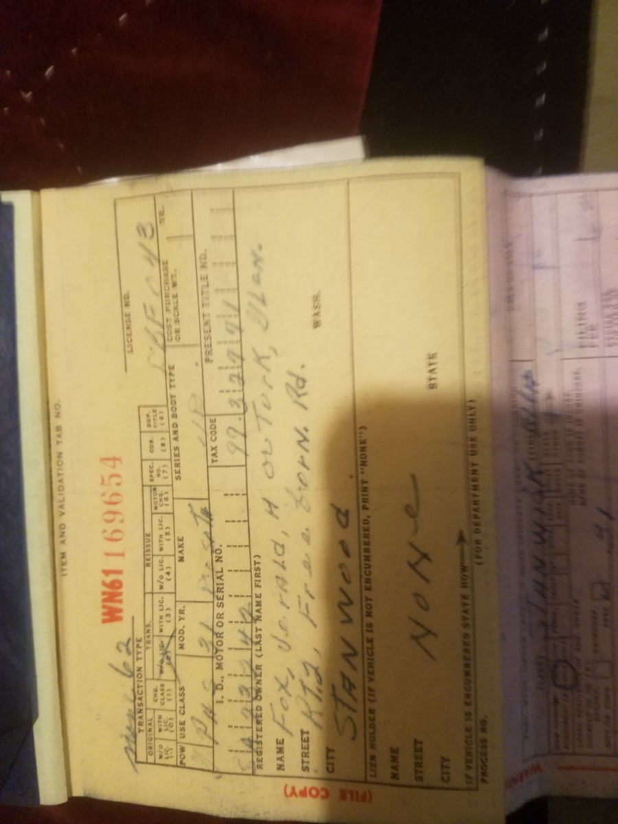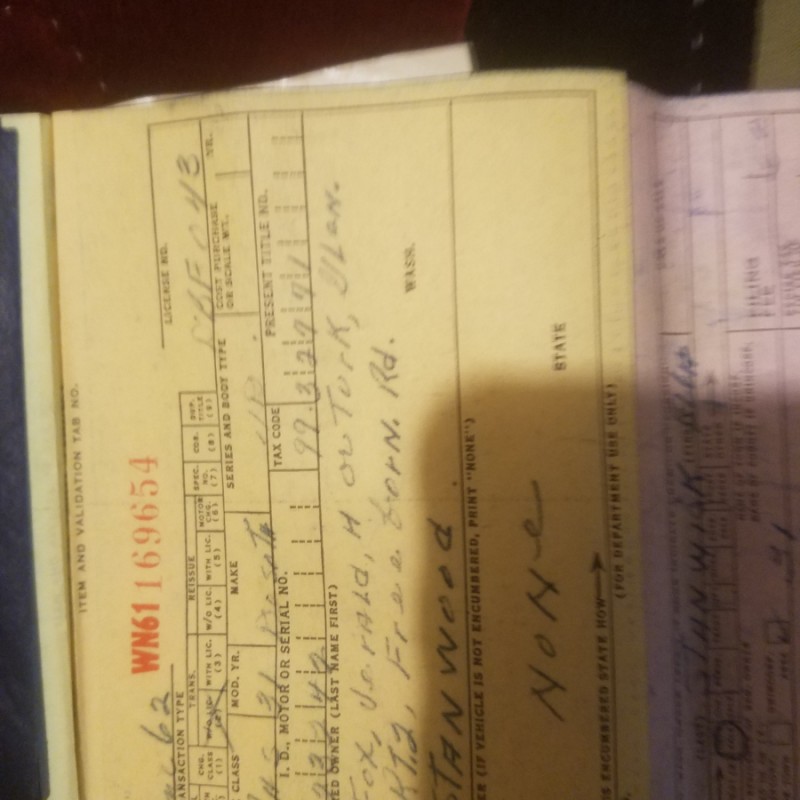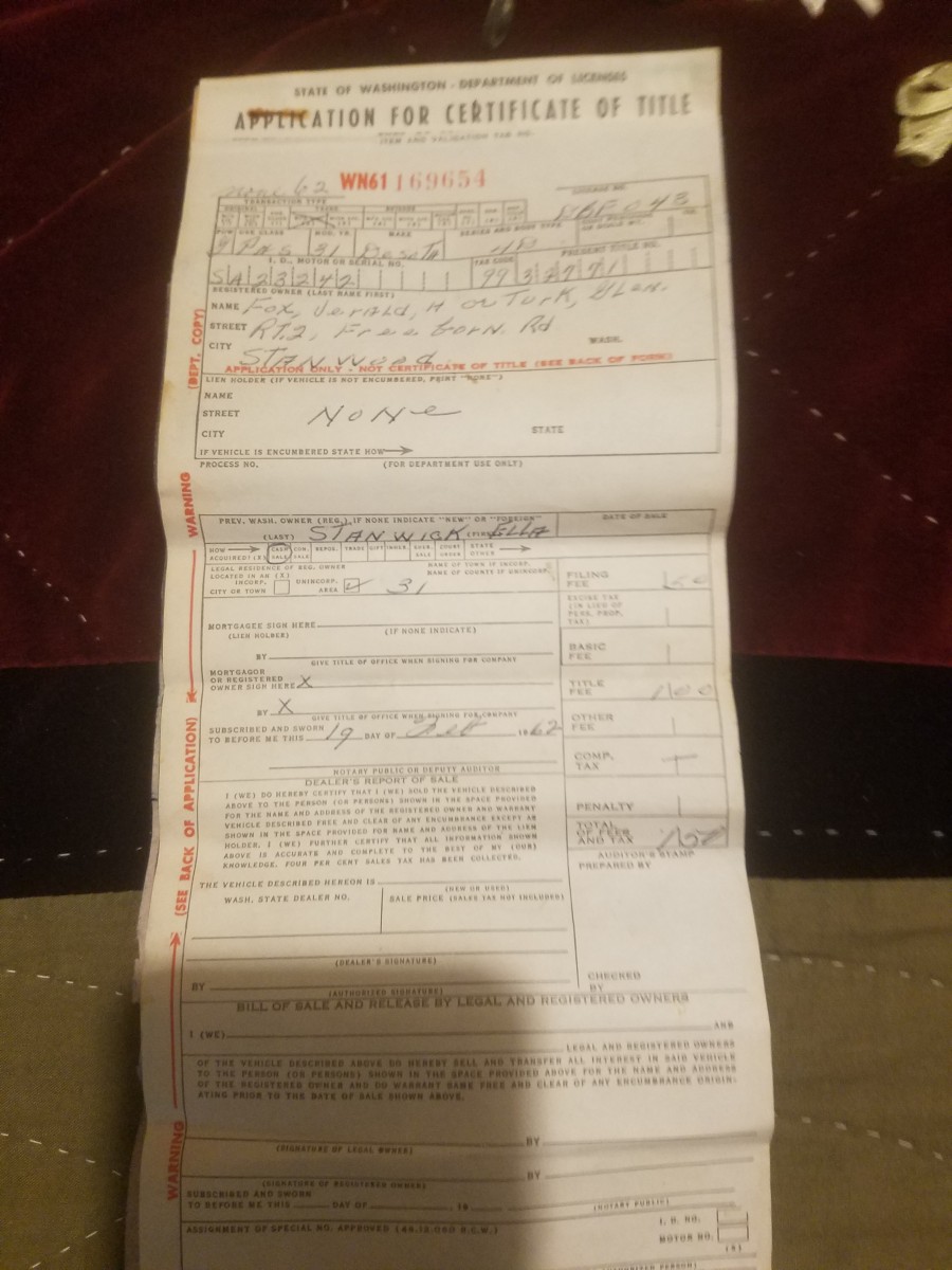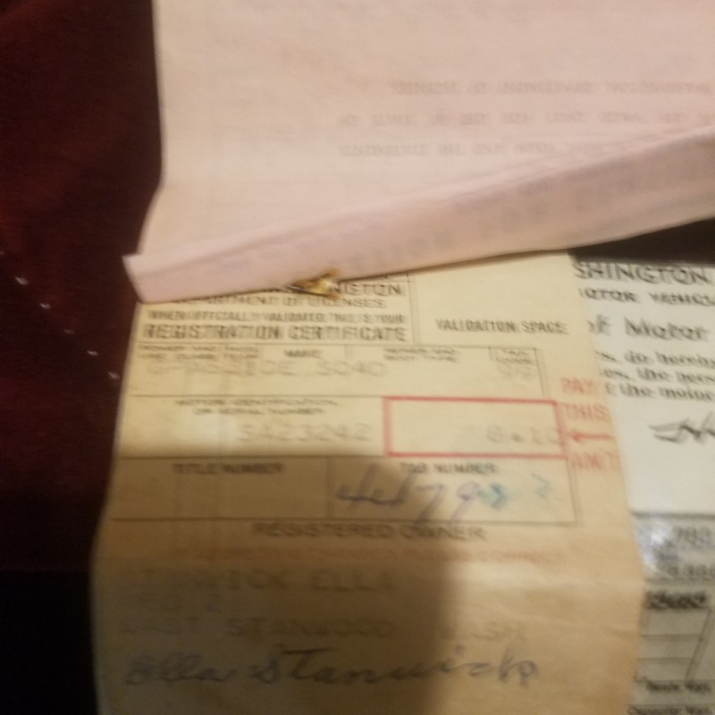 Washington State title for a 1931 Desoto Sedan dated March 3, 1947, 1974 registration, and title application triplicate forms all with Stanwood Washington addresses.