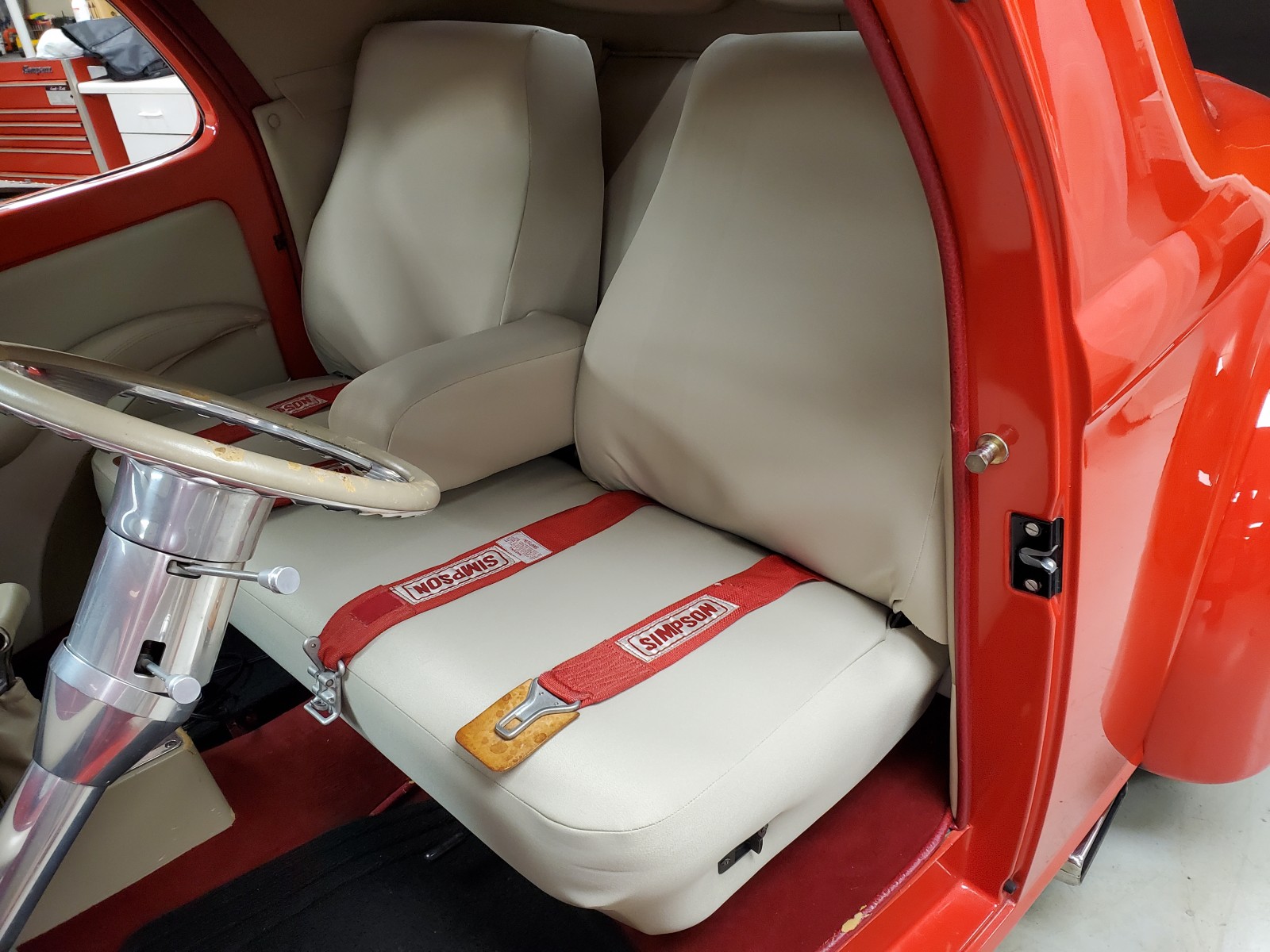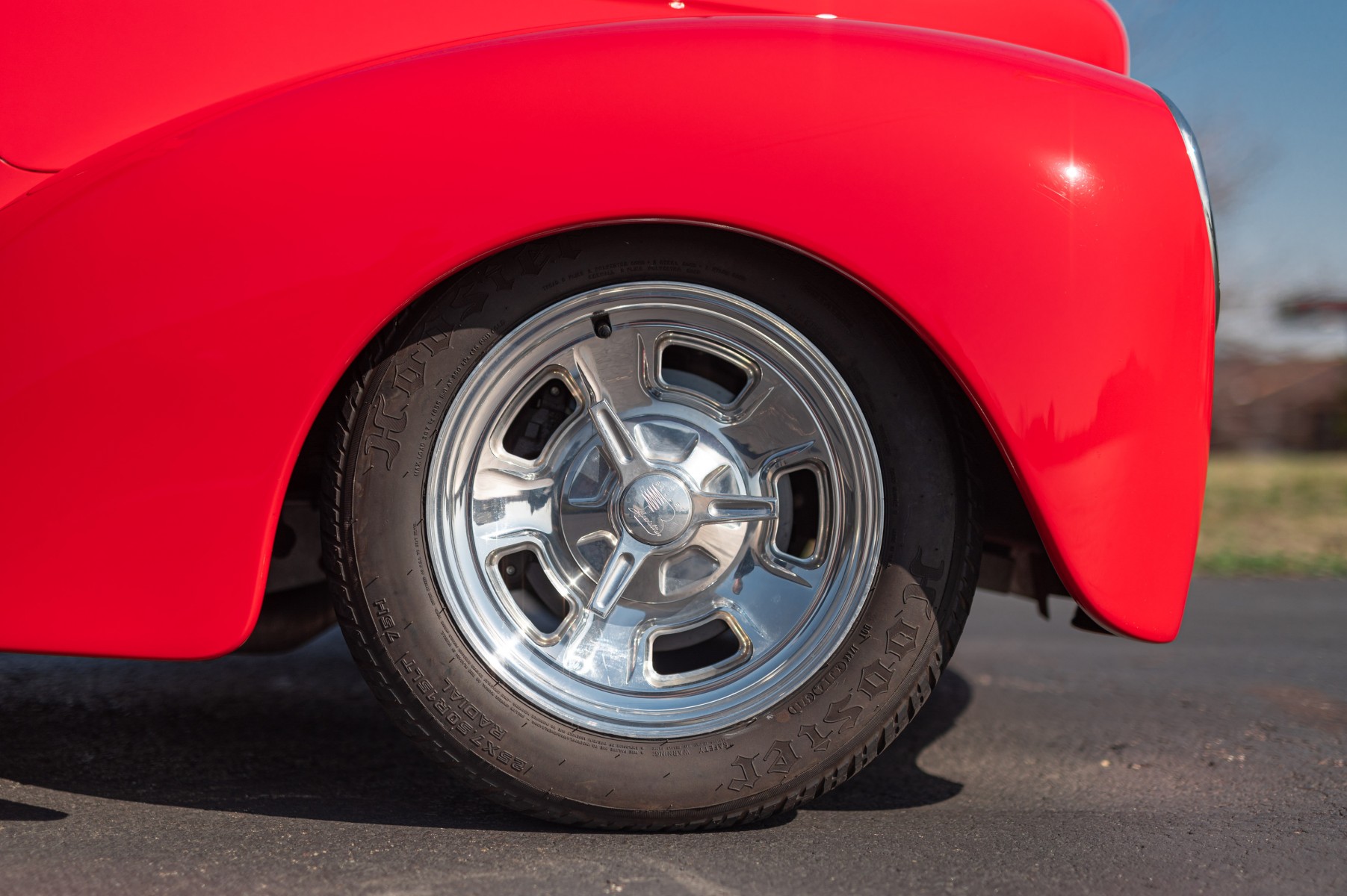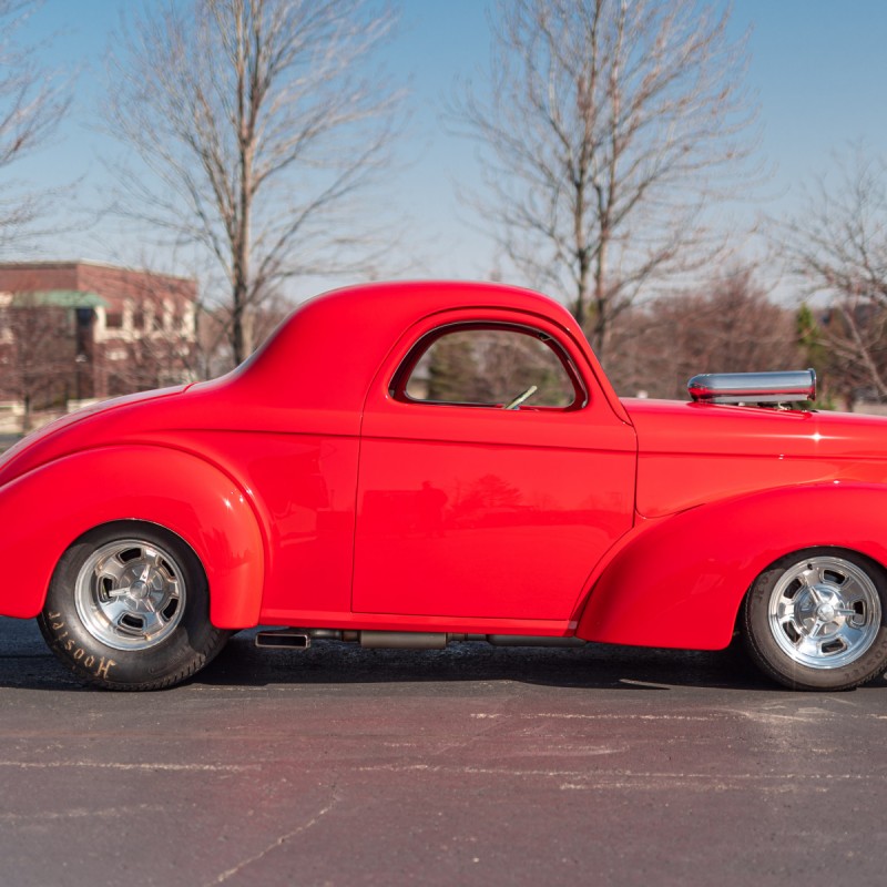 1941 Willys Americarn Pro-Street coupe. This special hot rod was built with an Outlaw Stage III tubular, powder coated chassis and 5-link rear coil over suspension. The body is fiberglass and was also manufactured by Outlaw. The finish is beautiful and is painted Viper Red. The interior is tan and ivory and covered in a pleather material. The pleather material that was used in creating the interior has been disintegrating and need to be replaced. As such, we stitched and installed a custom set of fitted seat covers that go over the seats. These are nice looking and very well made. The car is further equipped with Billet Specialties wheels 15x6 fronts and 15x16 rears with Pro-Street Hoosier tires. The GM 468cid engine is equipped with a B&M 671 blower, roller cam and valve train and a steel crank. The car was built by the recognized pro builder Terry Pennington.