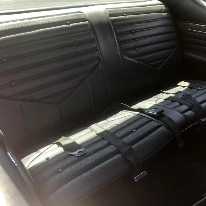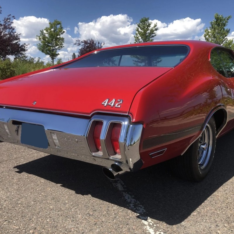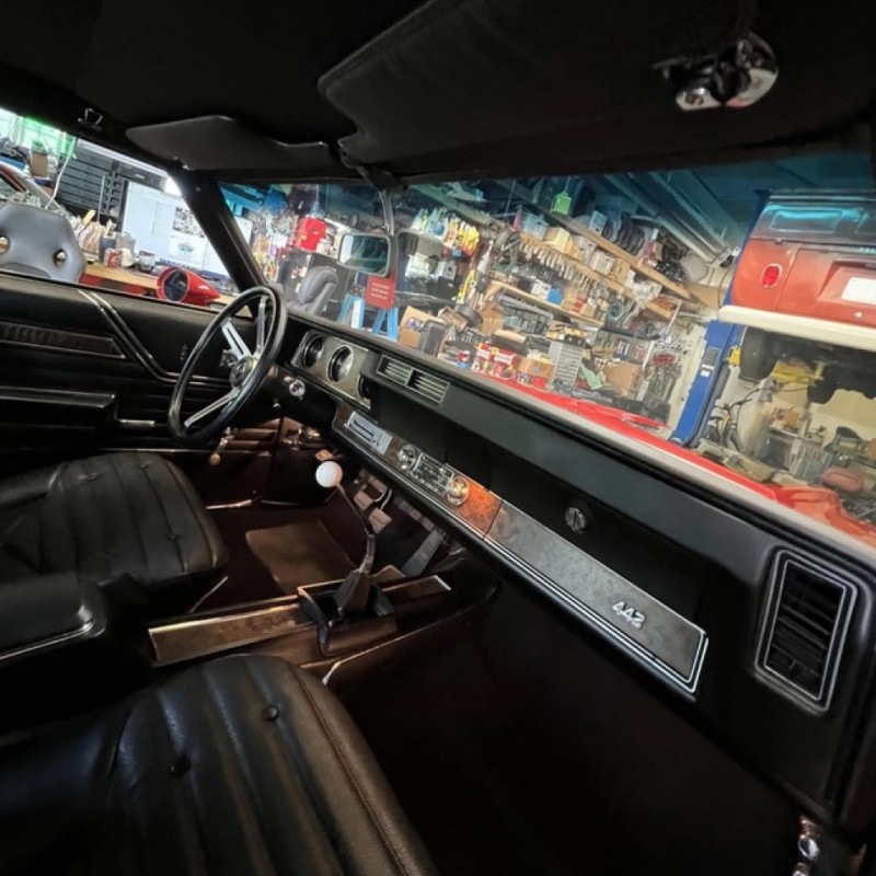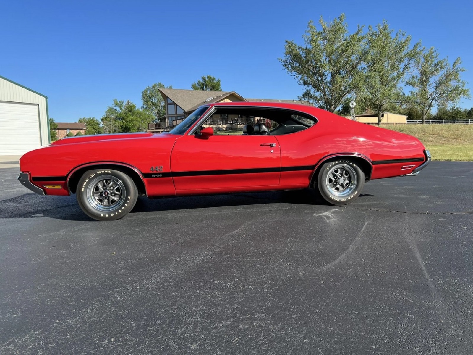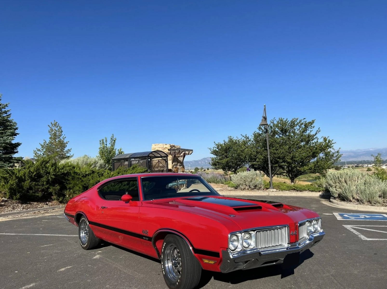 This 1970 Oldsmobile 442 coupe is finished in red with black stripes over black vinyl and is powered by a 455ci V8 mated to a four-speed manual transmission and a 12-bolt rear axle. Equipment includes a center console, tilt steering column, sport steering wheel, Hurst 442-branded shifter, front bucket seats, Rally Pac instrumentation, power steering, a heavy-duty radiator, and an AM/FM radio.